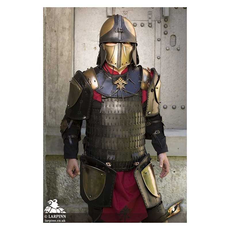Epic Armoury’s Ratio Torso is an asian-inspired lamellar cuirass designed to protect the upper body. Offering excellent protection and great mobility, this armour also has a lavish design, scaly appearance, and a rustic, gleamy look. The front is made of overlapping steel panels stitched with top-grain leather cords, while the back is shielded by thick leather. Secure this cuirass by tightening the heavy leather straps at the shoulders, further adjusting with two straps along the sides for a perfect fit.