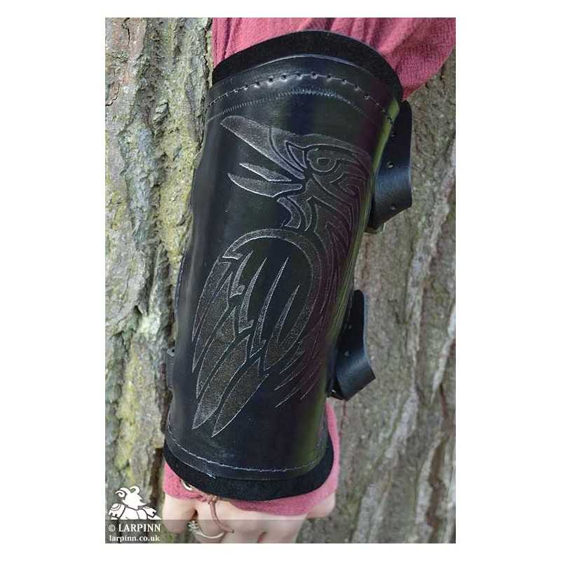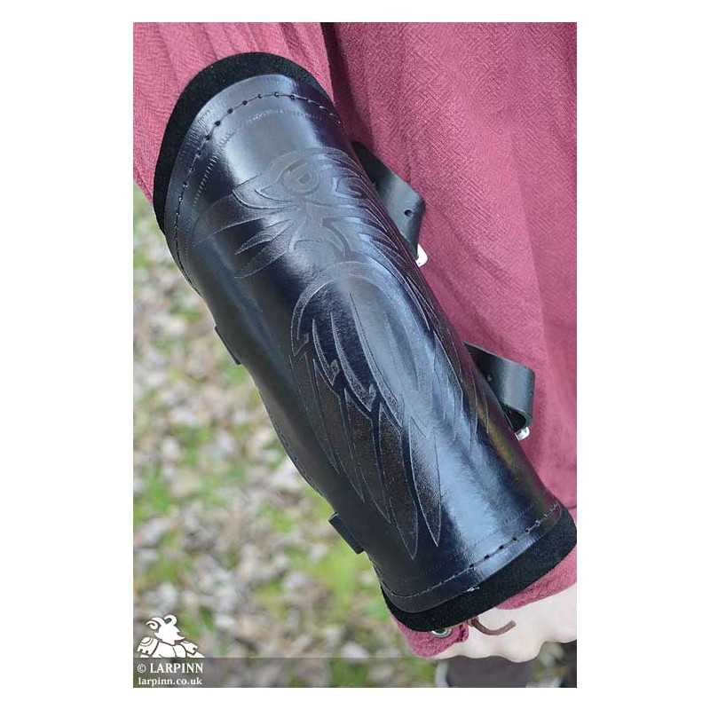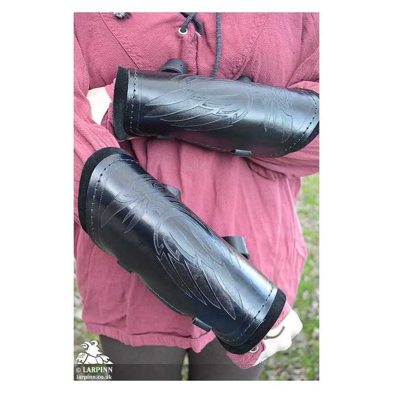 These bracers are made from two layers. The top layer is high-quality veg tan leather, embossed with the design and hand-dyed. The back plate is made from soft suede to add comfort. The supple leather molds to the wearer's arms over time, ensuring a personalized fit for maximum mobility.