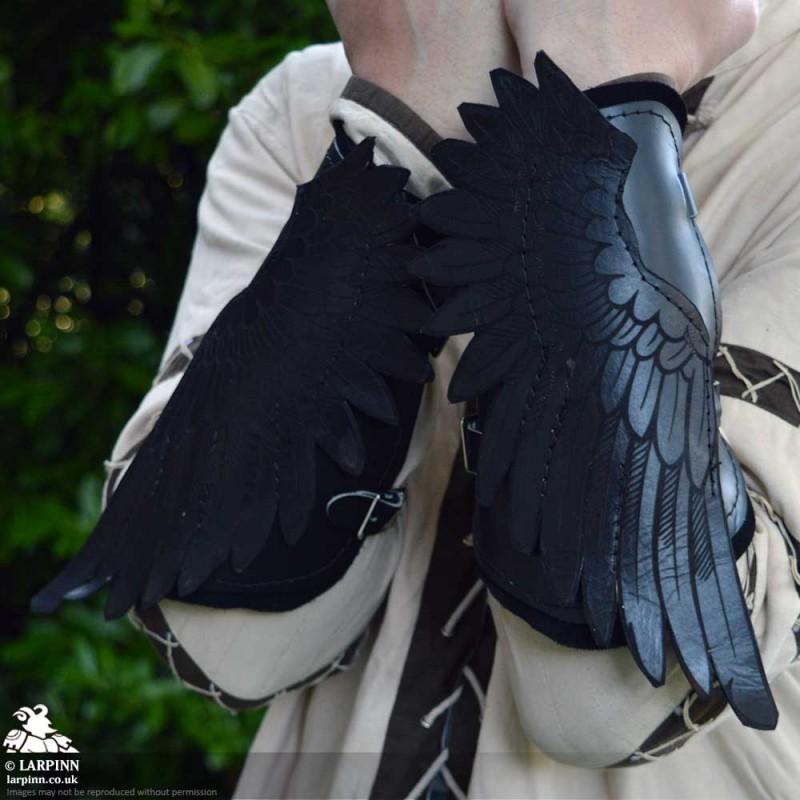 The leather face is made from flexible veg tan leather embossed with a design, then hand painted, dyed and sealed. The bracers are then backed with a soft calf-suede lining which is sewn with a trim to increase comfort. The bracers are closed with a pair of strap and buckles.
