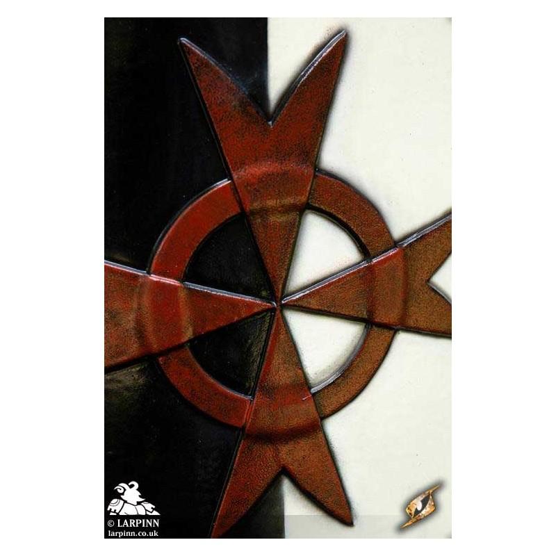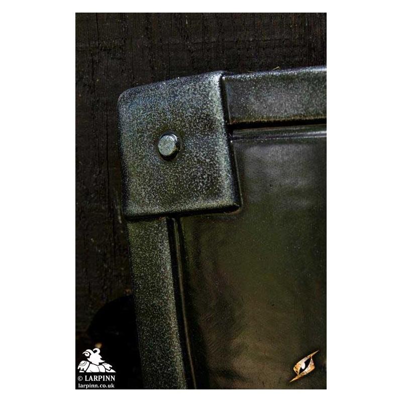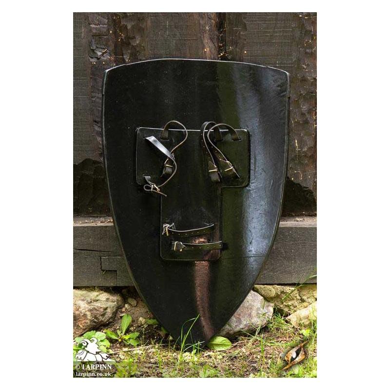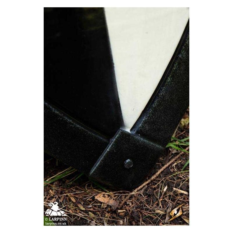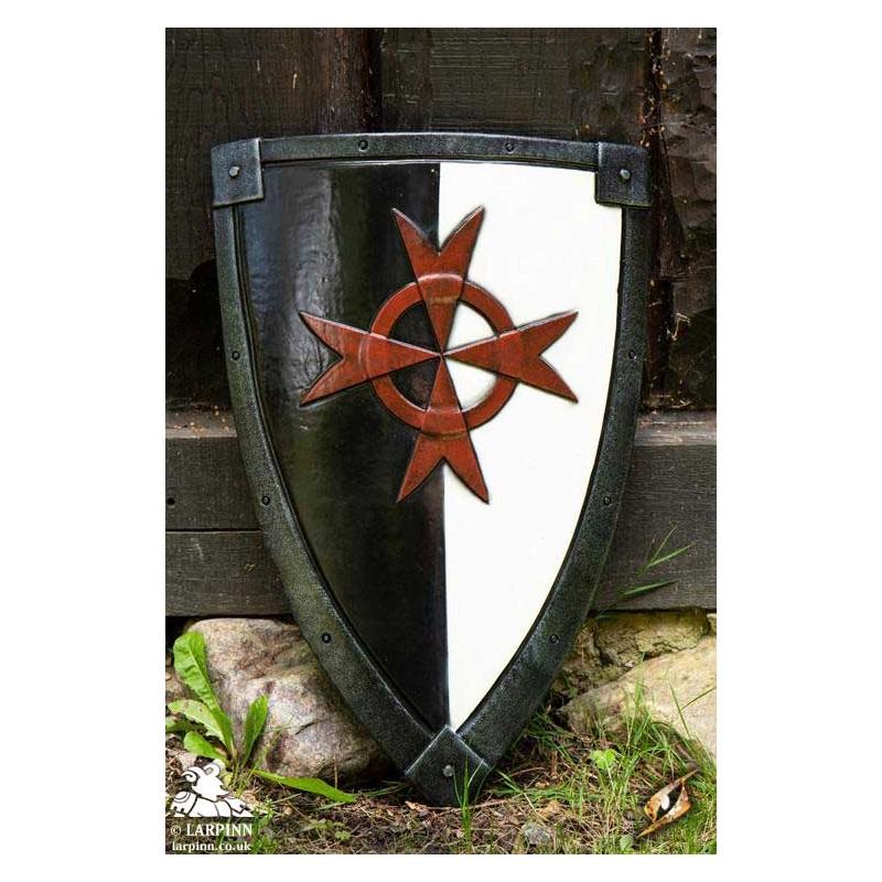 Epic Armoury’s Crusader Shield is a semi-curved, kite-shield inspired by 10th to 12th century Normans. painted with a thick black and white contrast and a heraldric symbol in the middel and a metalliac edge, this shield will fit perfectly in the hands of a crusader or other religious infantry member for Larp.