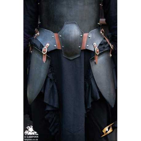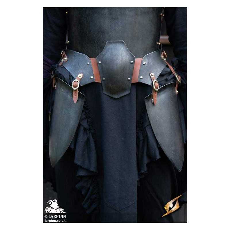 The Dark Renegade Belt & Tasset is a combined belt and tasset , handcrafted from 1mm thick mild steel, and offers great protection and agility. The shape of the front plate is specifically designed to protect the upper thigh and lower waist, while also be more comfortable for a female player. The belt and tassets consist of a metal belt that loops around your waist with two tassets covering each front of your thigh. The tassets are connected to the belt via two vegan leather straps on each end of each tasset, which can be individually adjusted for the perfect fit. The belt and tasset designs, leaves both the inner thighs and crotch area exposed at the benefit of higher mobility.