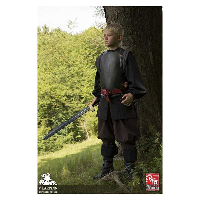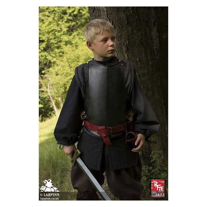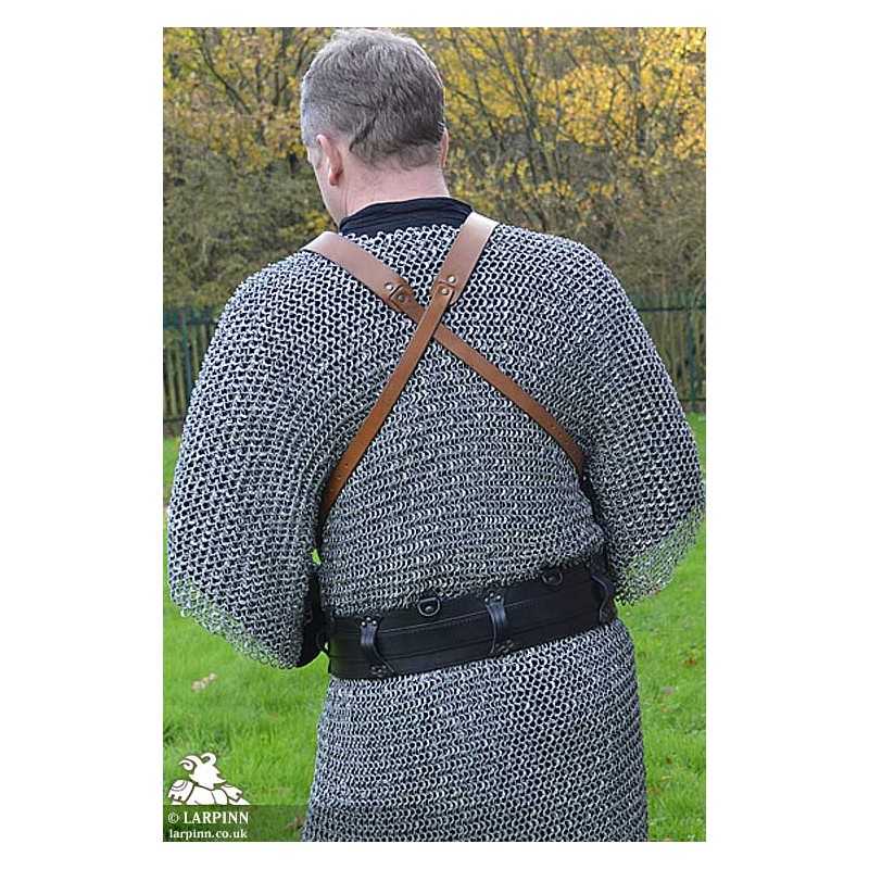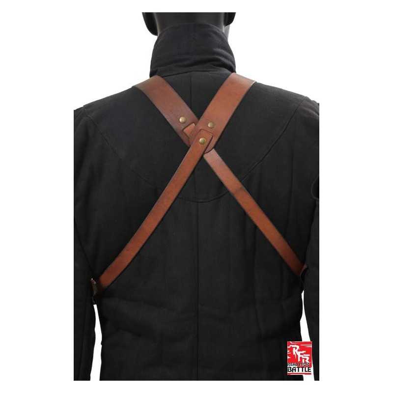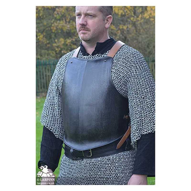 Secure the RFB Breastplate by tightening the 4 cm wide leather straps across the back, keeping the breastplate in place over your gambeson. Made of polished 1 mm thick mild steel and top-grain leather straps and fittings, this armour piece is built to withstand the abuse of a LARP or reenactment with regular leather and metal armour care.