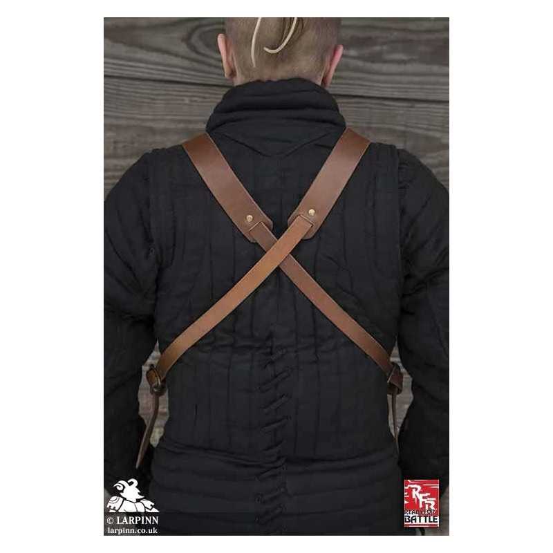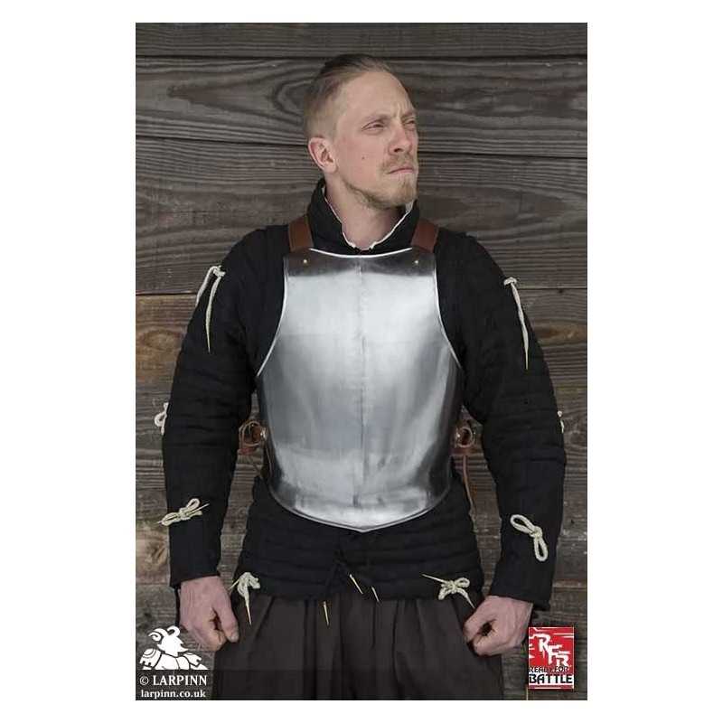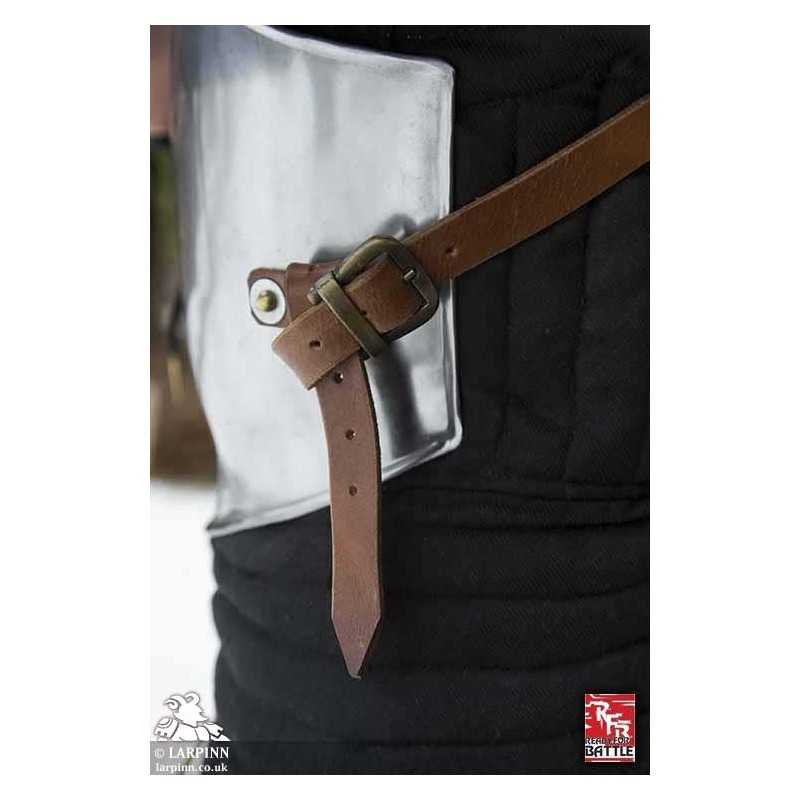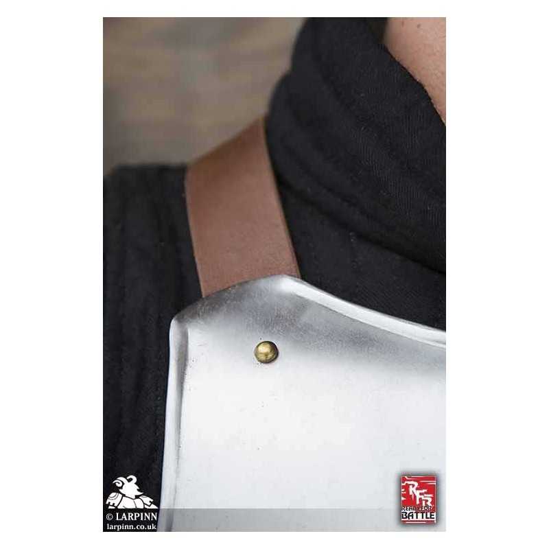 Secure the RFB Breastplate by tightening the 4 cm wide leather straps across the back, keeping the breastplate in place over your gambeson. Made of polished 1 mm thick mild steel and top-grain leather straps and fittings, this armour piece is built to withstand the abuse of a LARP or reenactment with regular leather and metal armour care.