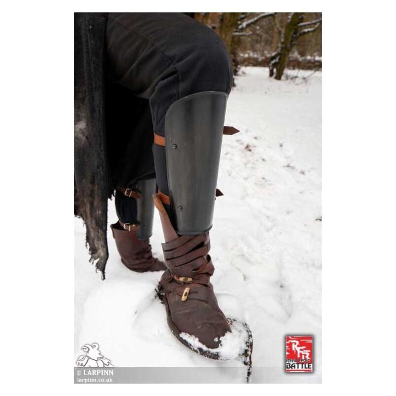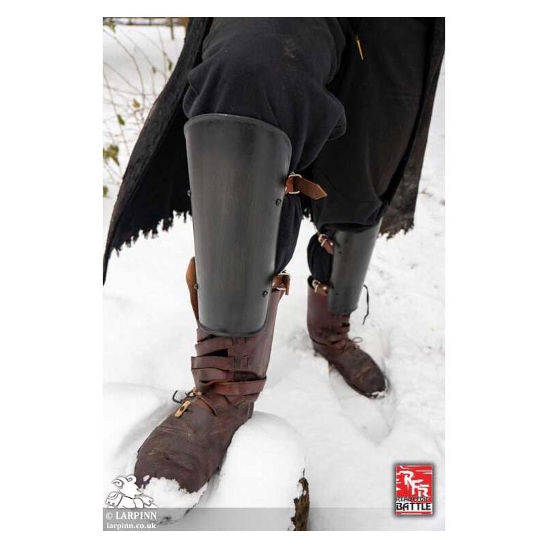 Two leather straps are used to keep each of the RFB Leg Protection greaves in place. Made of 1 mm thick mild steel and top-grain leather straps and fittings, these oxidation resistant coated armor pieces are built to withstand the abuse of a LARP or reenactment with regular leather and metal armor care.