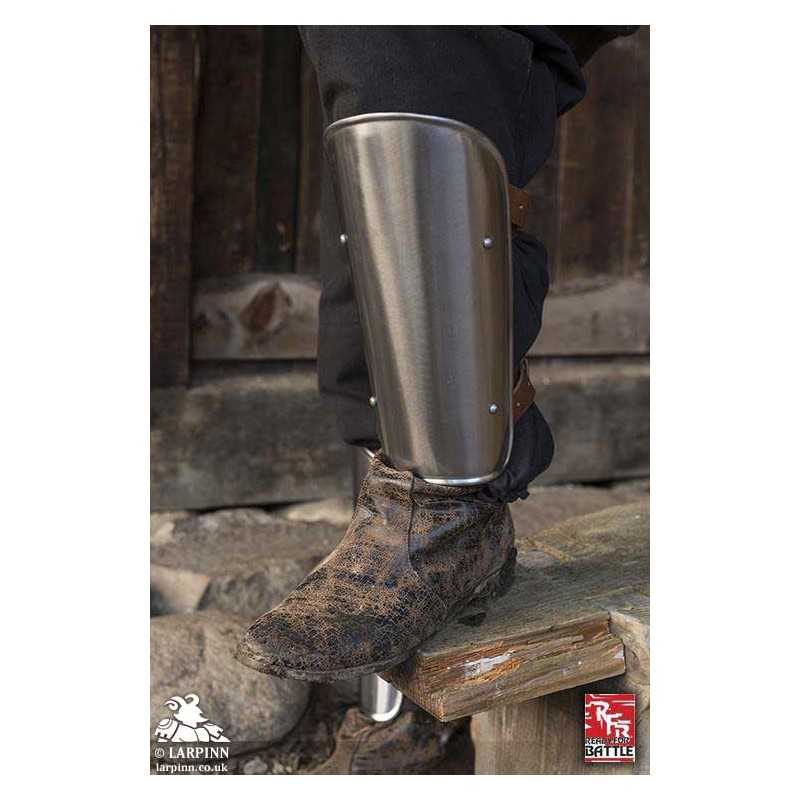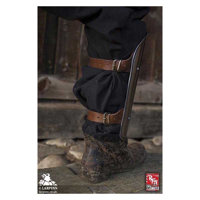 Two leather straps are used to keep each of the RFB Leg Protection greaves in place. Made of 1 mm thick mild steel and top-grain leather straps and fittings, these oxidation resistant coated armor pieces are built to withstand the abuse of a LARP or reenactment with regular leather and metal armor care.