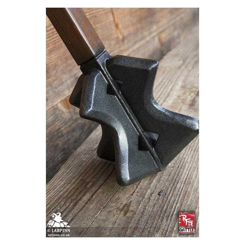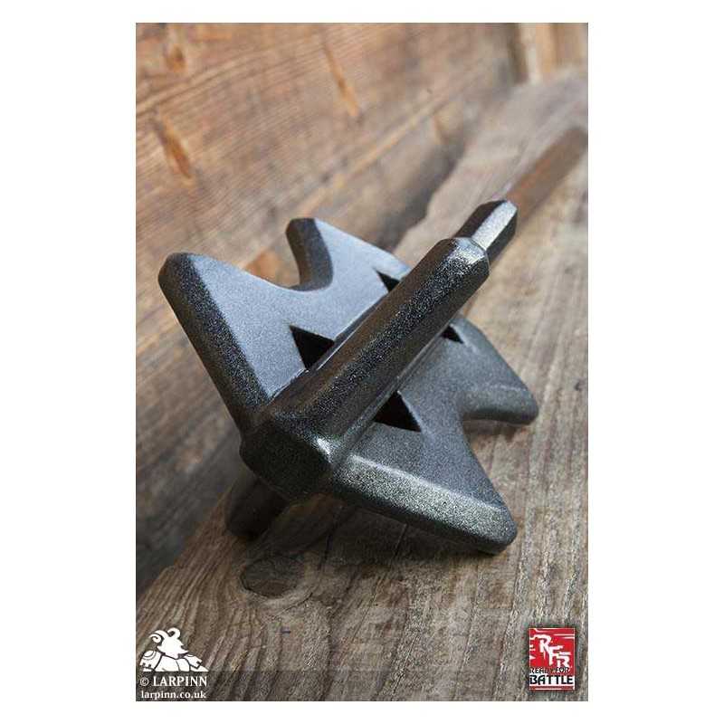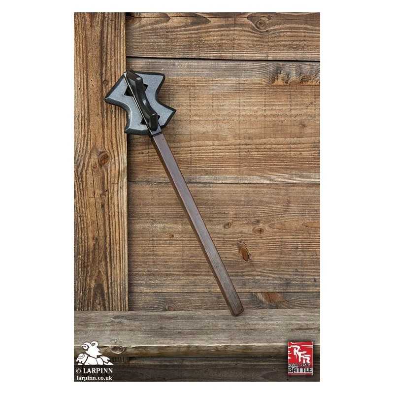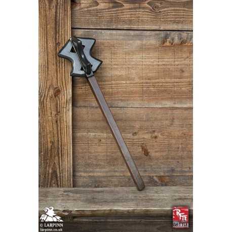 Epic Armoury’s Ready for Battle Mace is an intimidating 60 cm latex mace designed to fit a wide range of settings, making it a good weapon for a new warrior looking to make his way. Its long square grip is 55 cm and ends in a 20 cm four-flanged mace head. The spiked flanges are detailed with beveled edges and negative space near the haft, its upper 8 cm spike shaped slightly longer than its lower companion.