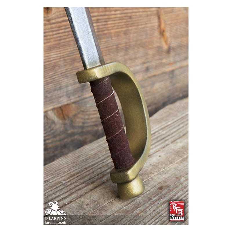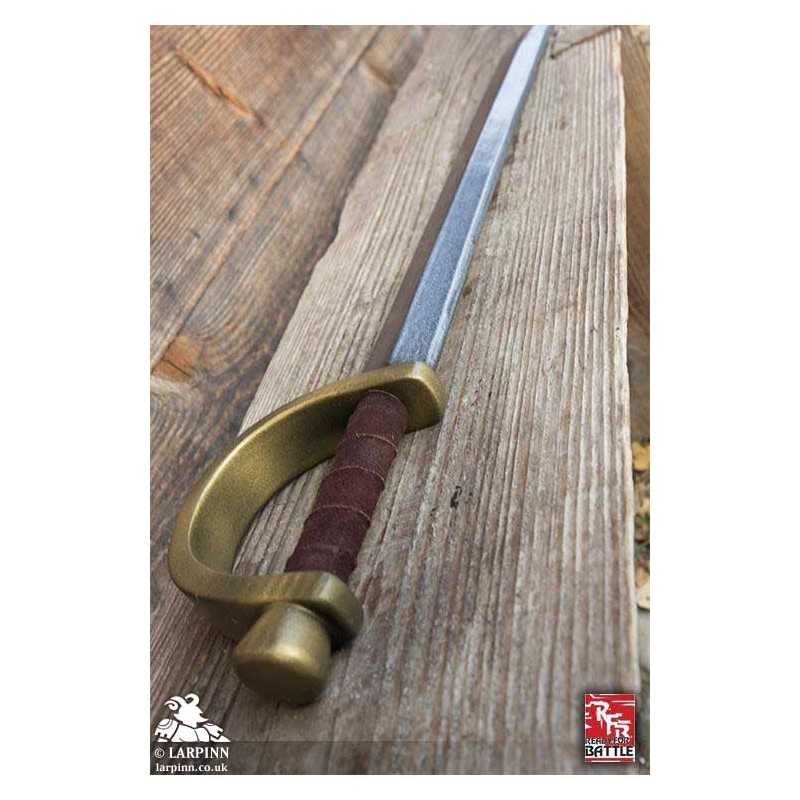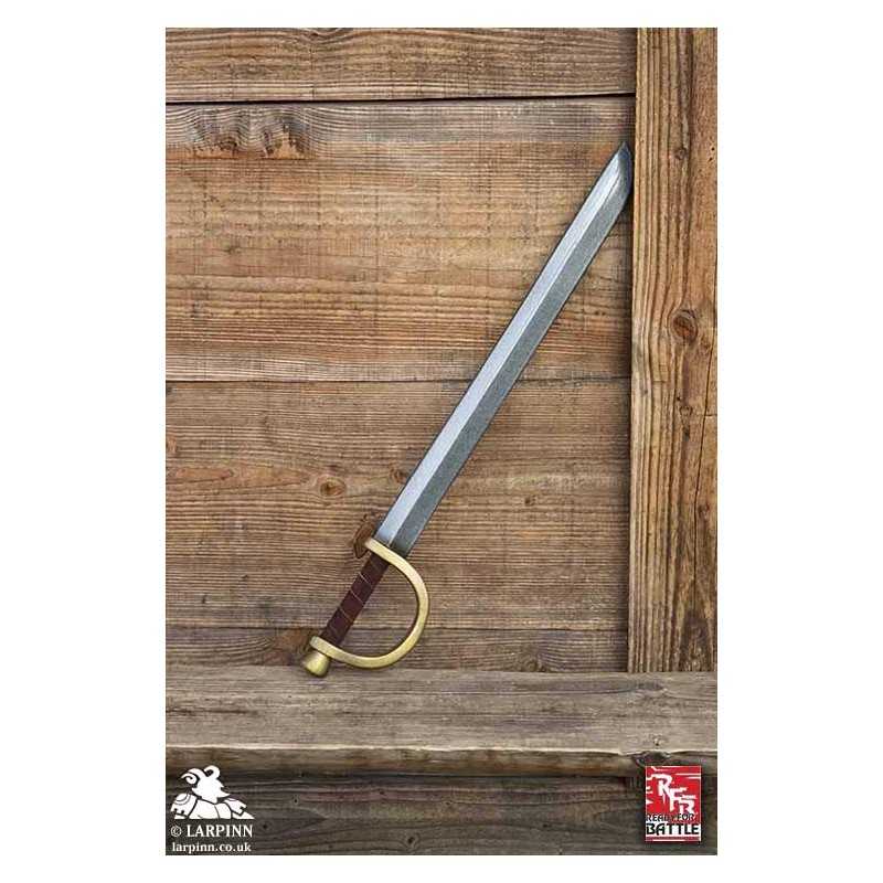 This bestselling Ready For Battle Pirate Sword is a straight blade for pirates, corsairs and landlubbers. The Pirate Sword is 77 cm long from tip to pommel, and comes with a 57 cm long blade with a single-edge. The blade has a handguard that protects the entire split-leather wrapped handle, attached from blade to rounded pommel.