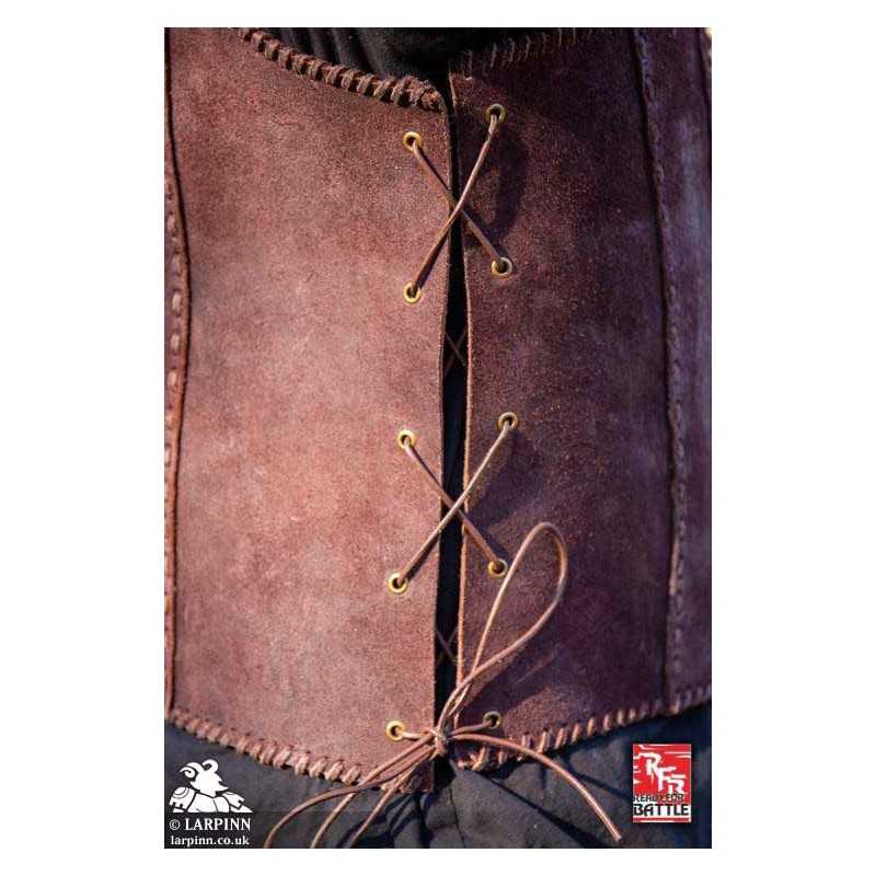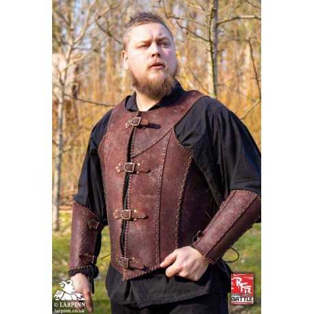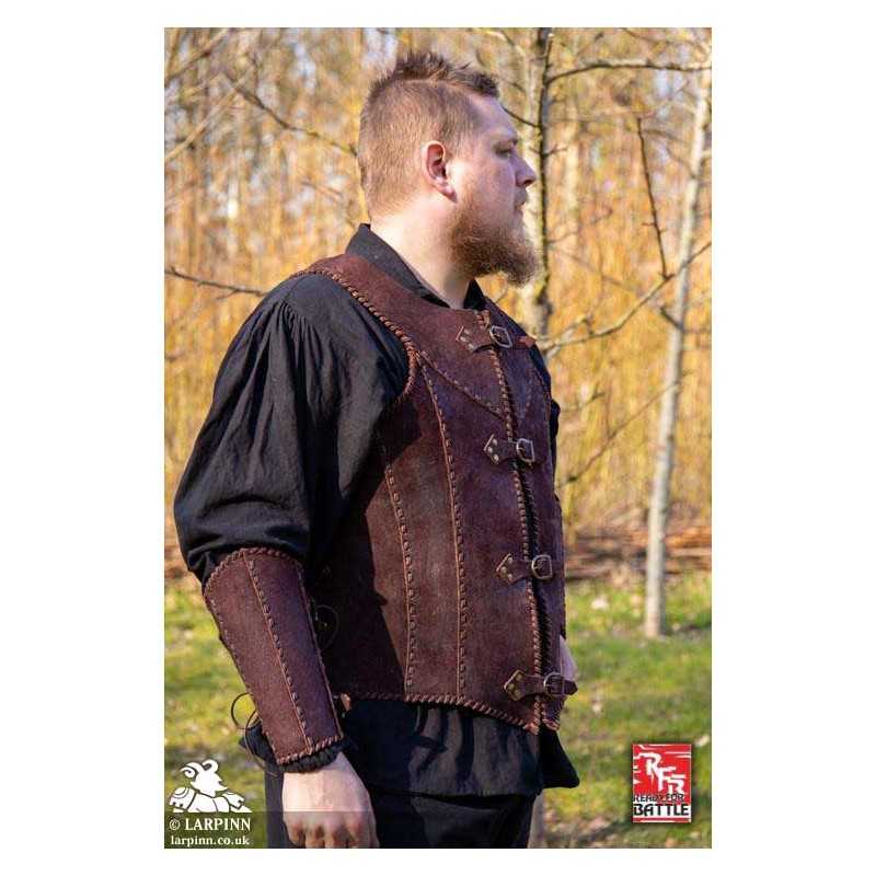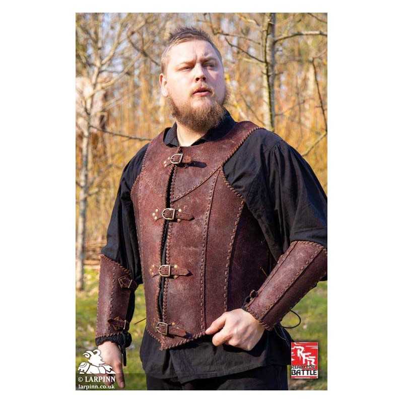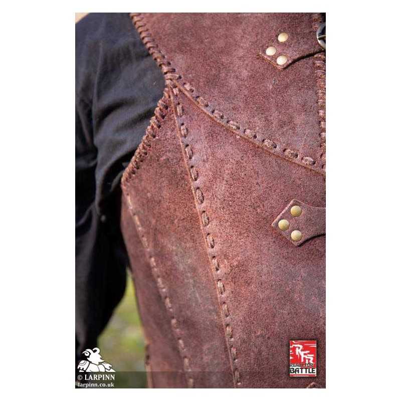 Hemmed with additional soft split leather to keep it from deforming with excessive wear, this armour will withstand any LARP abuse, you might force on it. The cuirass matches our Veteran Greaves and Bracers, but has a distinct, neutral style that will fit with almost any combination of costuming in the medieval and renaissance eras. Wear it over chainmail or a padded gambeson, or - for a more casual look - over a tunic or doublet, when you embark on your next adventure.