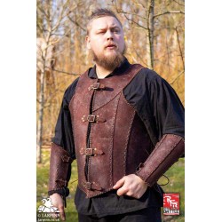 This armour is hemmed with additional soft split leather to keep the armour from deforming with excessive wear. This armour matches our Viking Armour and Greaves, but has a distinct, neutral style that will fit with almost any combination of costuming for your first adventure.