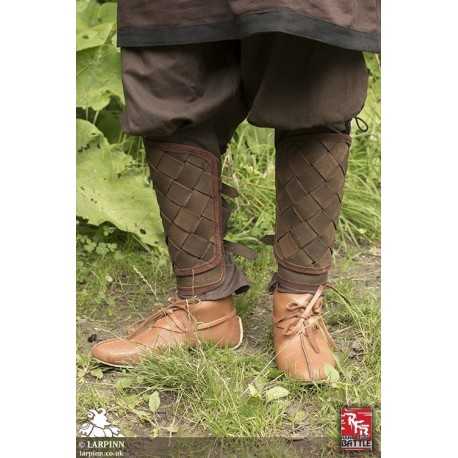 Epic Armoury’s Ready-for-Battle Viking Greaves are fancy leather greaves designed to protect the calves. The armour is constructed from leather straps cut from chrome-tanned, split leather, and weaved together to create a beautiful design. The armour is secured to the leg by sturdy leather straps and brass buckles.