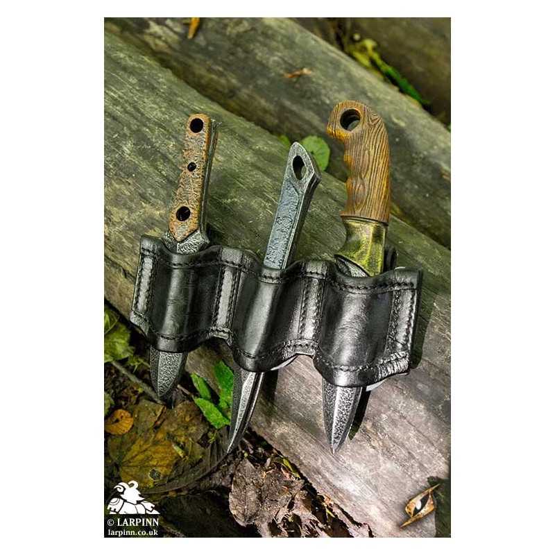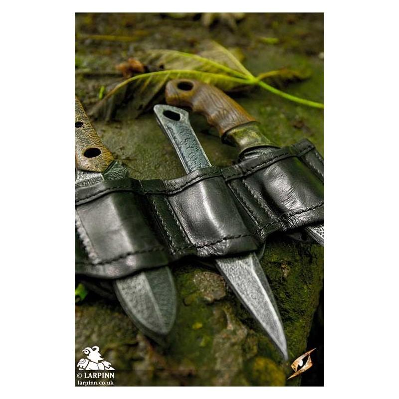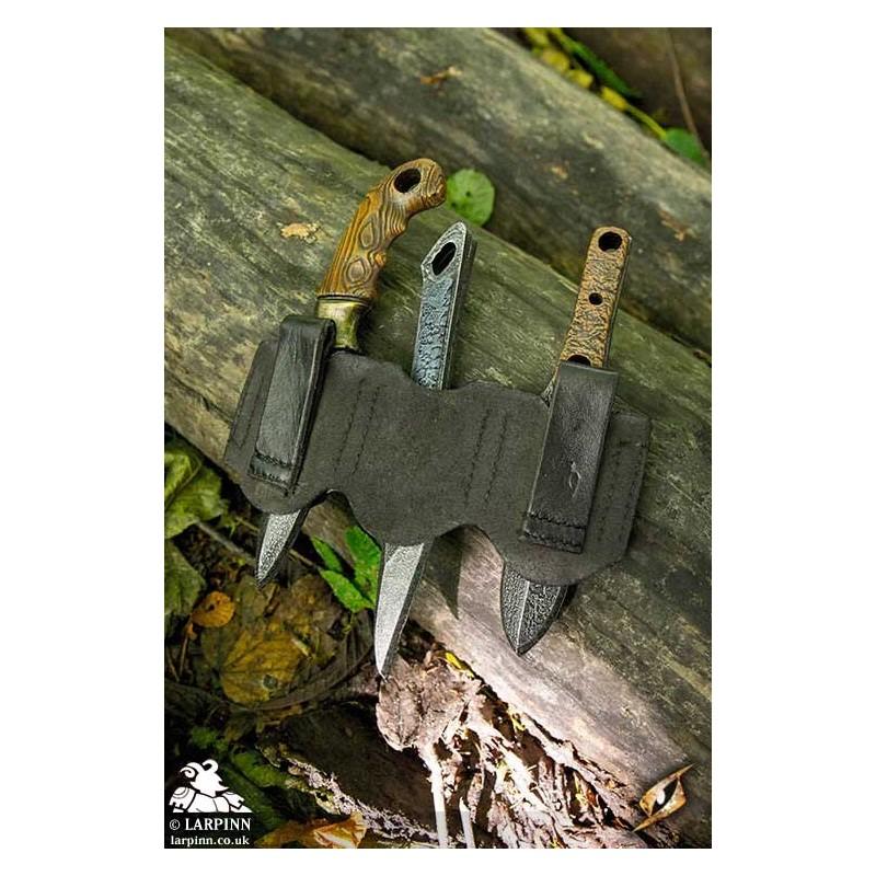 Epic Armoury’s Rogue Knife Set Holder, is designed to hold up to three Epic Armoury throwing weapons and comes with a Thrust knife, a Cutthroat knife and a Woodsman knife. The handmade holder attaches to the belt using leather loops on the backside.
