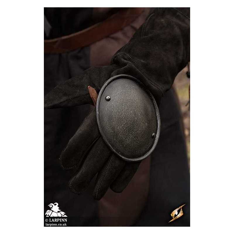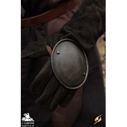 Epic Armoury’s Epic Dark Rondel Hand Protection is a round plate designed to protect the knuckles and back of the hand in combat without compromising manoeuvrability. The plate is forged to fit over the hand using a durable and adjustable leather strap that fits across the palm. The steel fits most comfortably over your own leather glove.