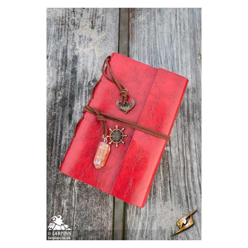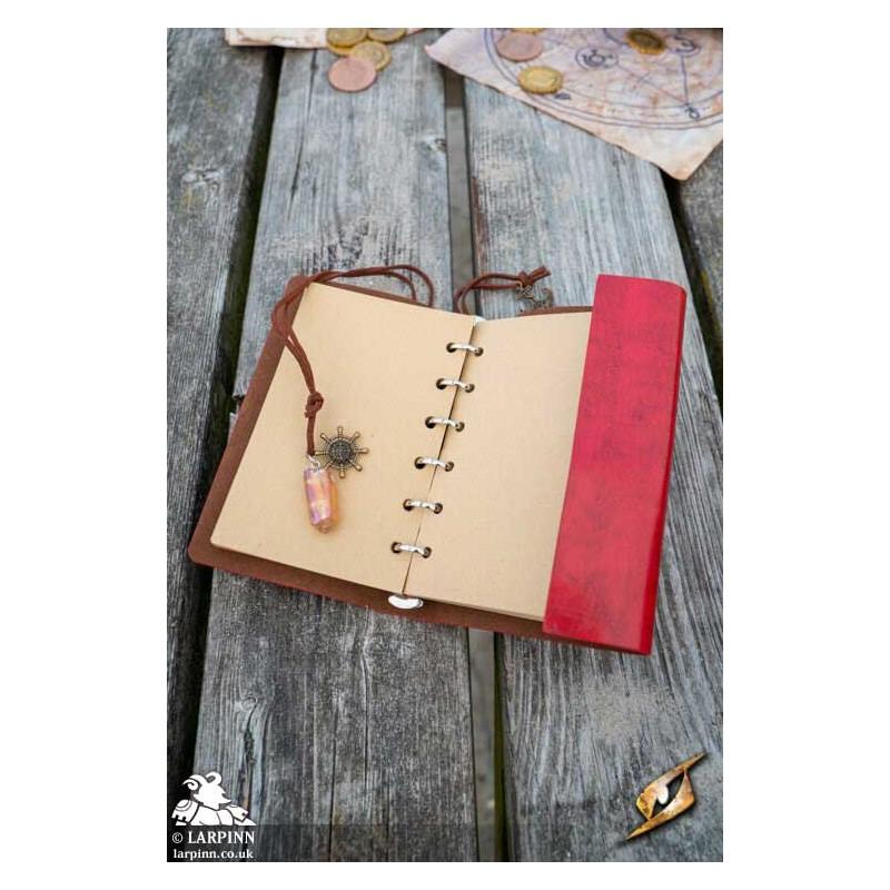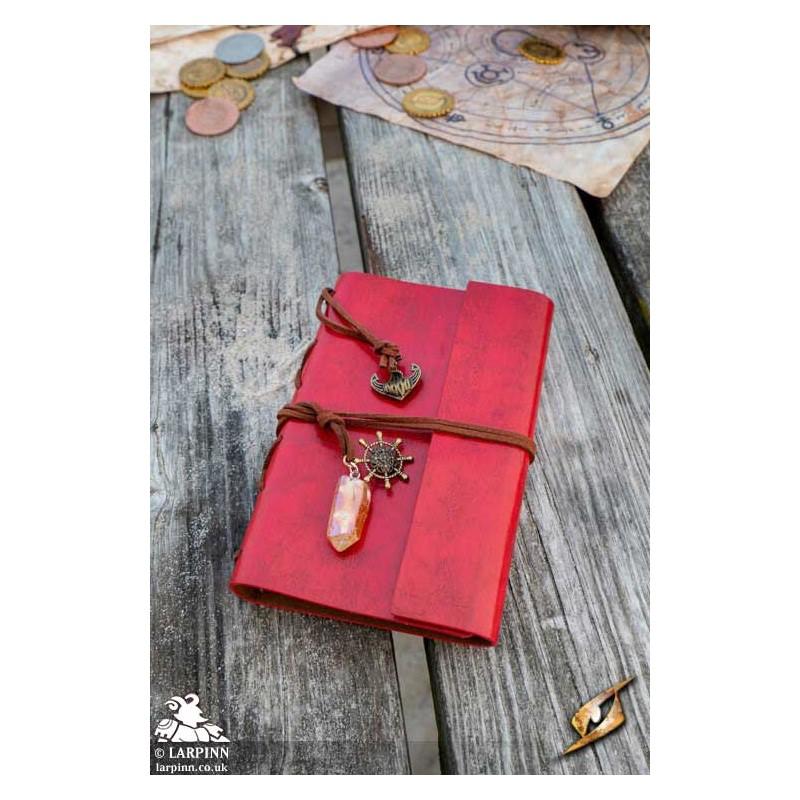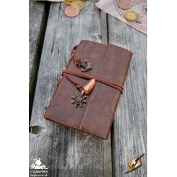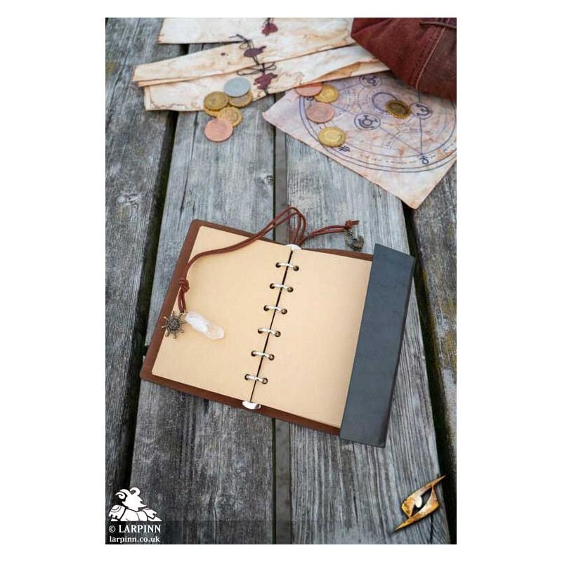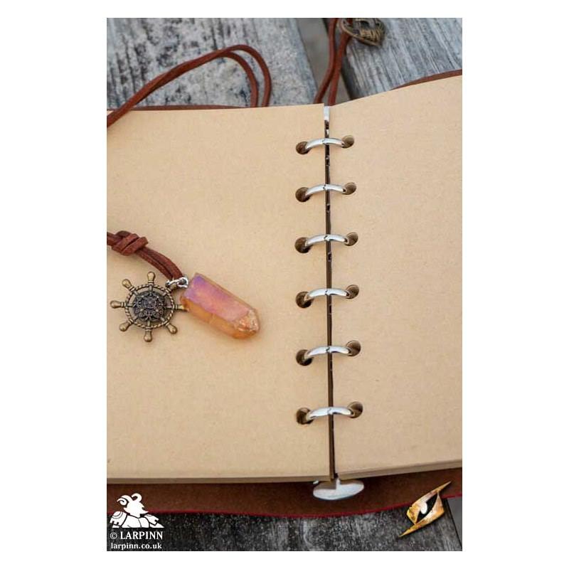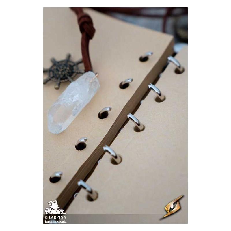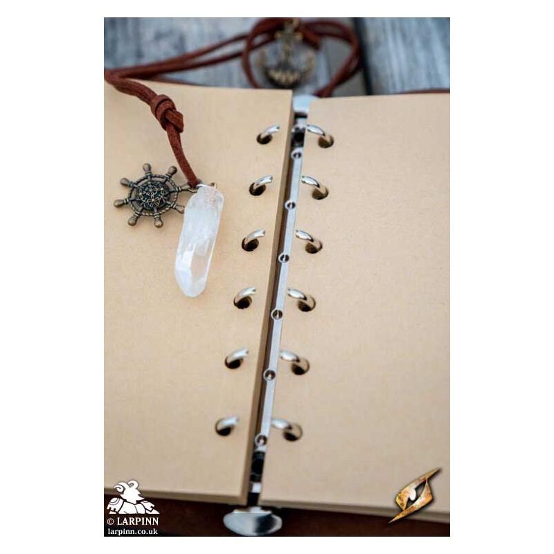 With the Epic Armoury Sailor’s Diary, you can now record notes on your quests or describe your adventures for future generations! The book is designed as a bound ring binder with 55 sheets of tanned, 6-hole punched sheets measuring 8.5 × 13 cm. Thus, it is easy to add or remove additional pages if needed. The cover and string are made from faux leather with three pendants attached: Two shaped like a ship’s wheel and an anchor, and a third made from crystal.