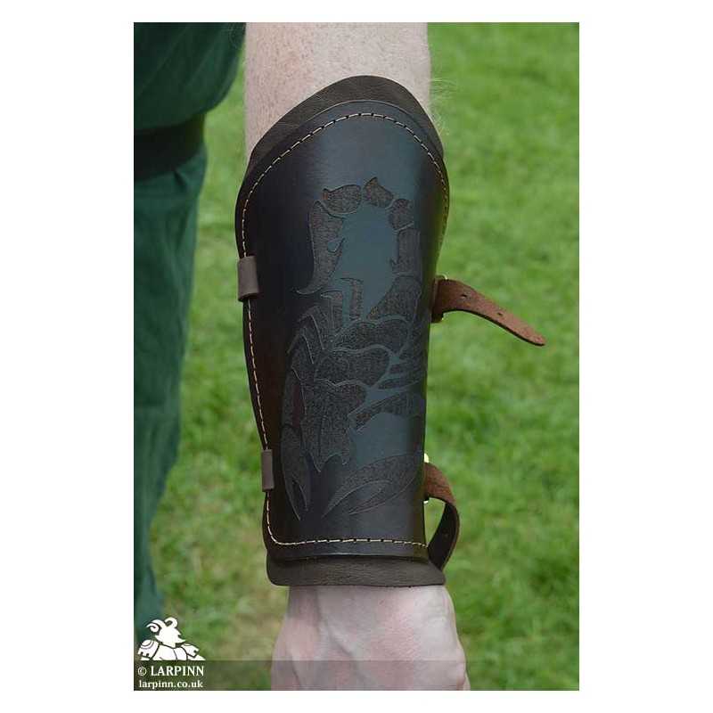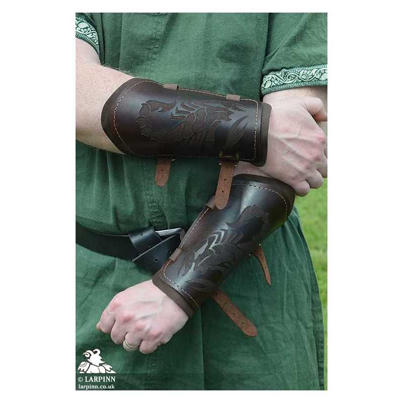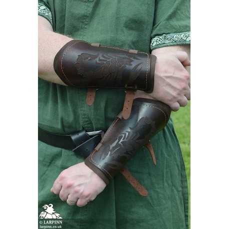 These bracers are made from two layers. The top layer is high-quality veg tan leather, embossed with the design and hand-dyed. The back plate is made from soft suede to add comfort. The supple leather molds to the wearer's arms over time, ensuring a personalized fit for maximum mobility.