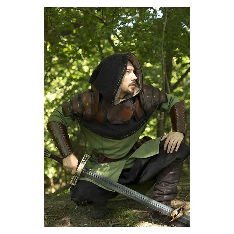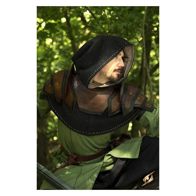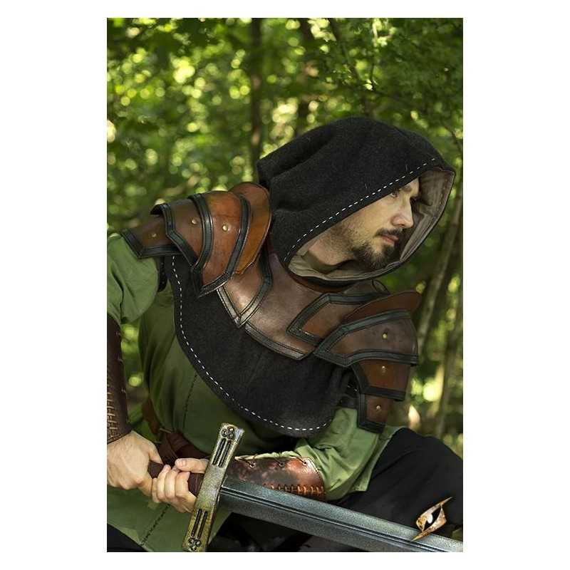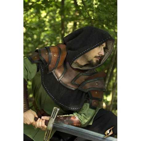 Epic Armoury’s Shoulder Armour and Neck Guard are a set of leather armour with two spaulders and a gorget to protect the shoulders and throat. Made from vegetable-tanned full-grain leather, this armour uses overlapping plates and two small sword-breakers to deflect attacks away from the head. All exposed edges are reinforced with leather and stitching to prevent it from deforming with excessive use.