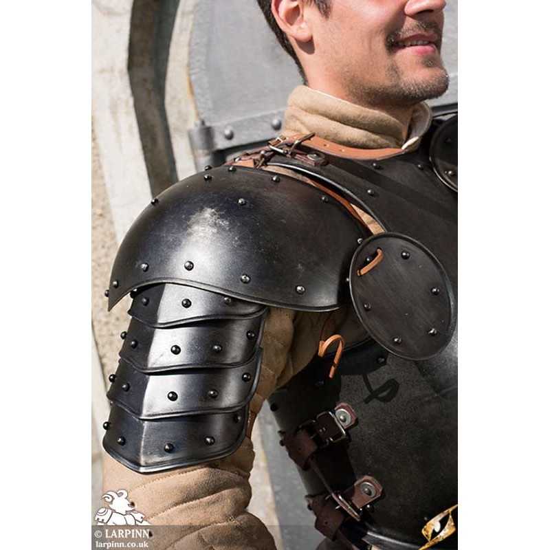 The Dark Warrior Shoulder Plates are a set of two shoulder guards with spaulders, pauldrons and besagues. The spaulders have five ridged metal plates--or lames--overlaying one another to provide laminate protection of the upper arms. Besauges (small round convex metal shields) tied onto the spaulders with leather cords add further protection to the armpits. Each plate is treated with Epic Armoury’s Epic Dark Metal coat, which gives the armour a rugged, antique finish. The shoulderplates are fastened with leather straps around the biceps and at the shoulder blade, attaching to a breast- and backplate. Epic Armoury breast- and backplates can be purchased separately and have fittings for mounting the shoulders.