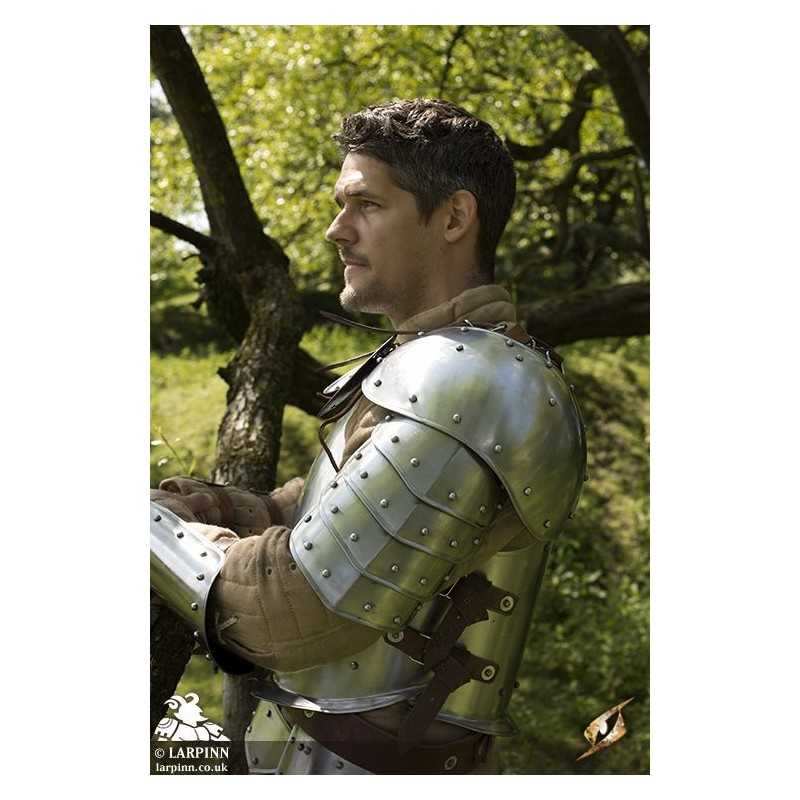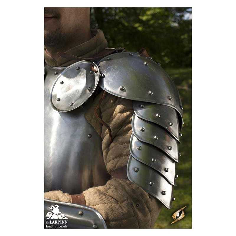 The Warrior Shoulderplates are a set of two shoulder guards with spaulders, pauldrons and besagues. The spaulders have five ridged metal plates--or lames--overlaying one another to provide laminate protection of the upper arms. Besauges (small round convex metal shields) tied onto the spaulders with leather cords add further protection to the armpits. The shoulderplates are fastened with leather straps around the biceps and at the shoulder blade, attaching to a breast- and backplate. Epic Armoury breast- and backplates can be purchased separately and have fittings for mounting the shoulders.