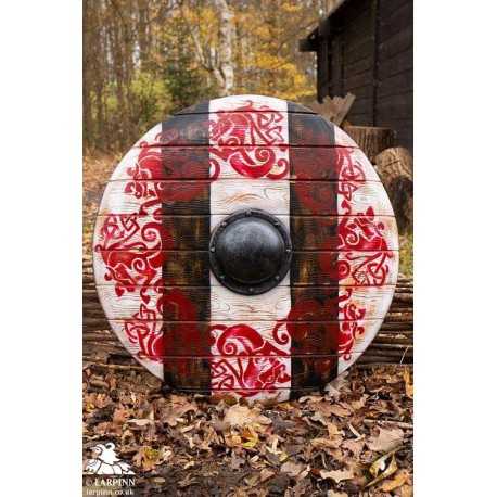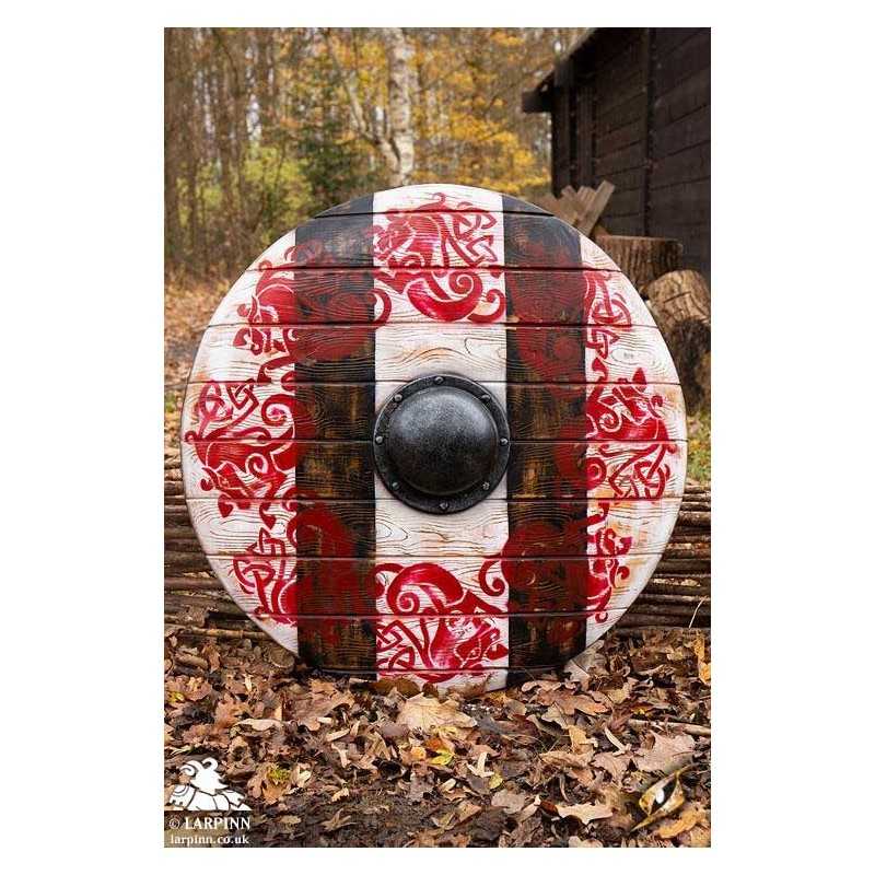 This shield has been hand painted, with white and black stripes and a ring of red Norse-inspired horses decorating its face. Its slight convex shape and the metallic-painted boss on the front provides an edge in combat, and its reliable punch-grip fits comfortably in your hand thanks to its suede wrap and shape. Keep your shield in great condition with regular latex maintenance.