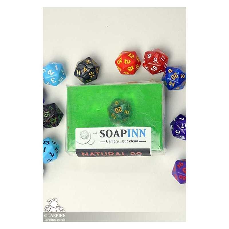 Our 'Soap Inn - Natural 20 Soap' is designed for gamers, by gamers. This handmade, vegan soap is made here at Larp Inn, UK and packaged up to make an excellent gift for all RPG and Dungeons & Dragons lovers. Our 'Soap Inn - Natural 20 Soap' is gently scented with darjeeling, tea rose and lavender and comes in a random colour. Inside each block is a D20 die, which can be easily released when the block has been worn down.
