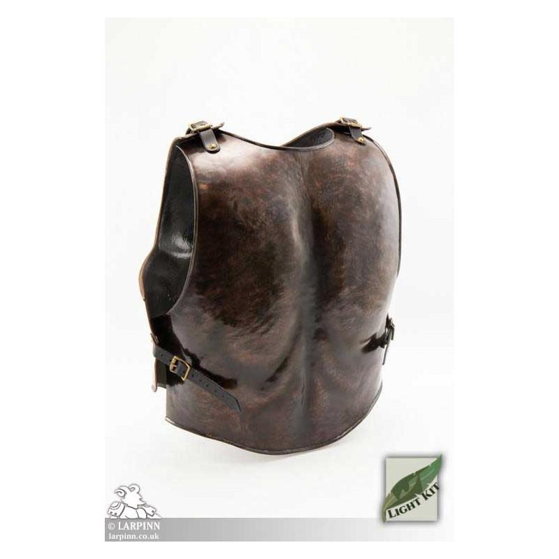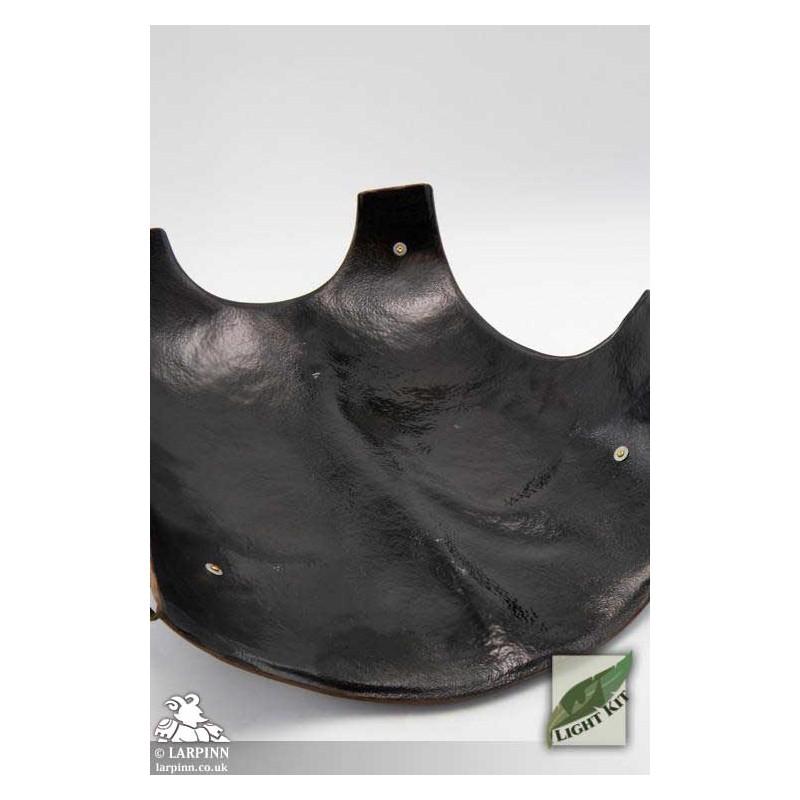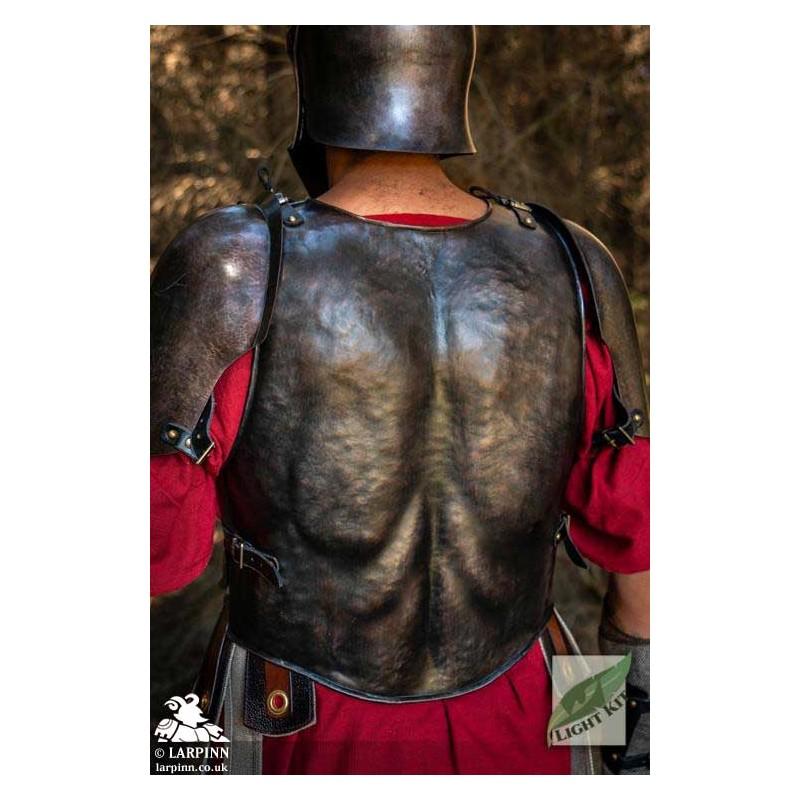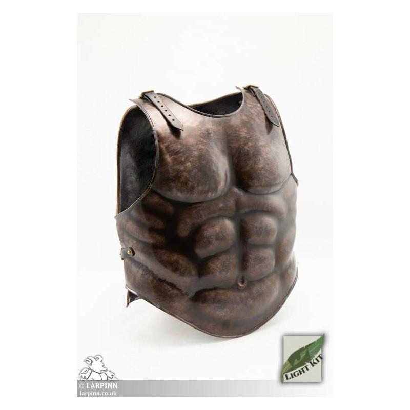 To the untrained eye, these polyurethane armours are difficult to distinguish from their metallic counterparts.They are, however, more comfortable to wear and can be worn for long periods of time without discomfort. Indeed, the flexible nature of this armour means that it can bend to the contours of your body in a way that rigid steel will not. Each part is typically a quarter of the weight of their steel equivalent, allowing for faster movement with less fatigue. Each piece is hand painted with a durable acrylic finish and is detailed to look as realistic as possible. The maintenance free finish will not rust like steel does and can be worn in all kinds of weather. Adjustable leather straps and the flexible nature of the armour allows it to be comfortably worn.The Spartan Light Kit Musculata is inspired by Ancient Greek body idealized armour and Hoplite soldiers.