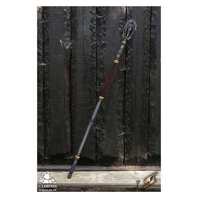 The Staff of the Arch Mage is a 190 cm latex staff with an imposing high-magic design. At its top sits a large crystal embedded inside four large flanges, each barbed and dangerous. The pole is handpainted and detailed with metal spindles and glamorous jewels around a 50 cm handle wrapped in split-leather.