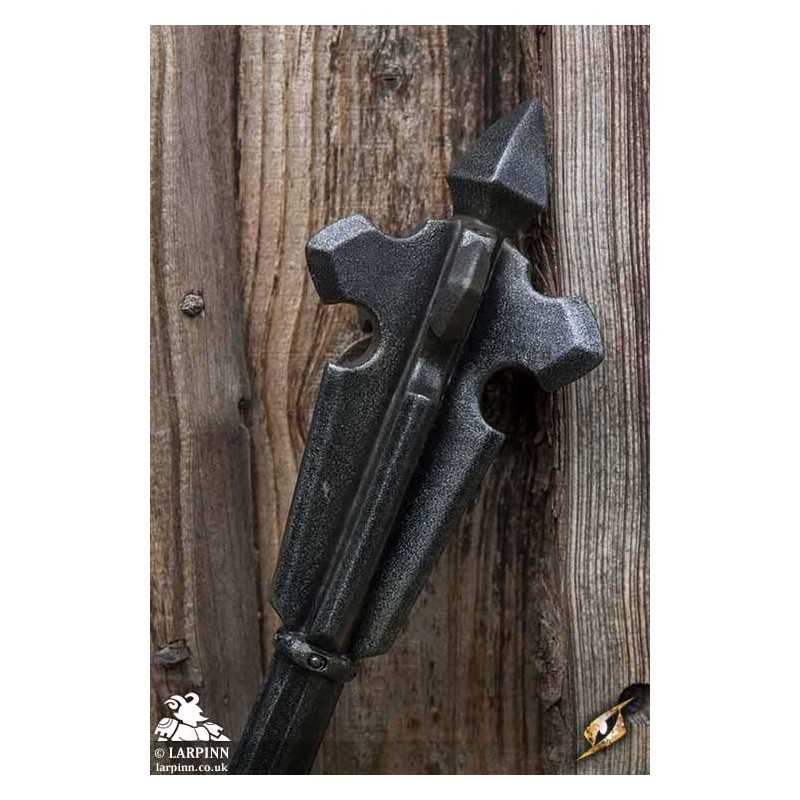 Epic Armoury’s Steel Mace is a 95 cm long latex mace inspired by historical medieval weapons. The mace has five long flanges along the 30 cm head, each featuring a speared spike and a separate spike at the top. A 10 cm handle at the end of the steel coloured and grooved staff is wrapped in black split-leather to provide a comfortable grip.
