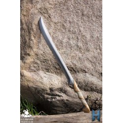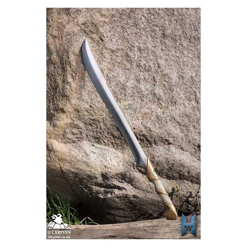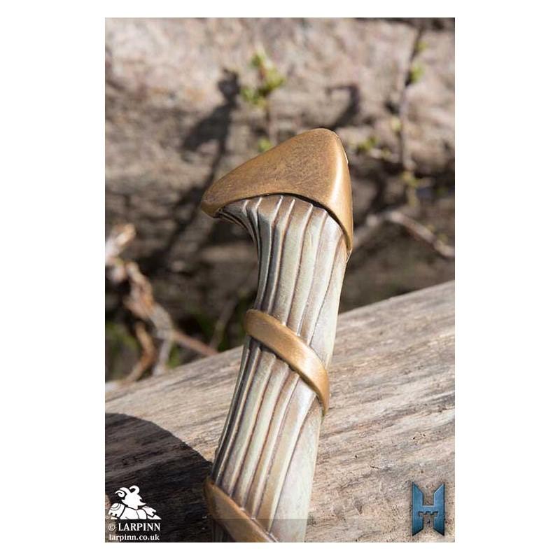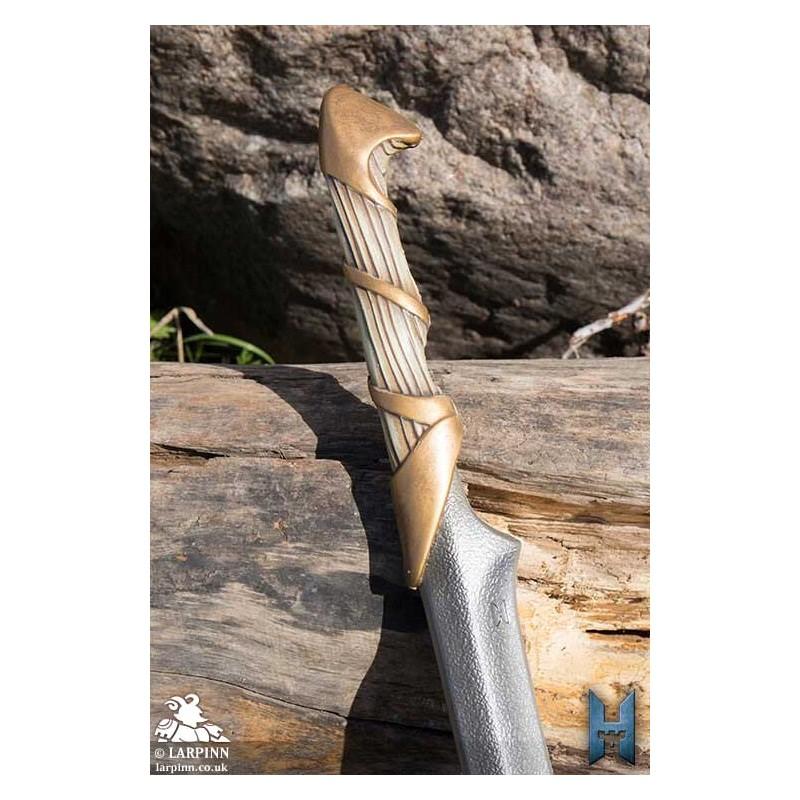 Stronghold’s Elven Hunter Blade is a medium sword inspired by creatures who dwell in the feywild. The sword is 75 cm long and has a 53 cm gracefully curved blade designed for slicing. The detailed handle features a handpainted finish that looks like faded gold wrapped around polished ashwood. The 15 cm grip is cast with a woodgrain texture and is ergonomically shaped, grooved to fit the hand.