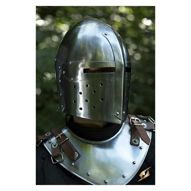 Epic Armoury’s Sugar Loaf Helmet is an enclosed helmet inspired by the traditional knight’s armour. Enclosing the entire head and offering maximum protection, this helmet is reinforced with rivets, rolled steel and a curved apex. Ventilation holes and a cotton inlay are added to the helmet to improve airflow and comfort. The eye-slits are wide and slim, increasing protection but impairing visibility.