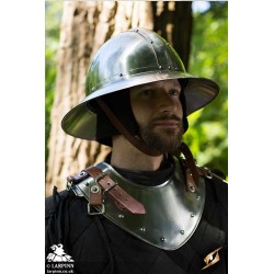 Secure the Sugar Loaf Helmet by tightening the leather strap beneath the chin, keeping the helmet in place. Made of 1 mm thick mild steel and top-grain leather straps and fittings, this armour piece is built to withstand the abuse of a LARP or reenactment with regular leather and metal armour care.