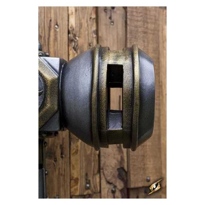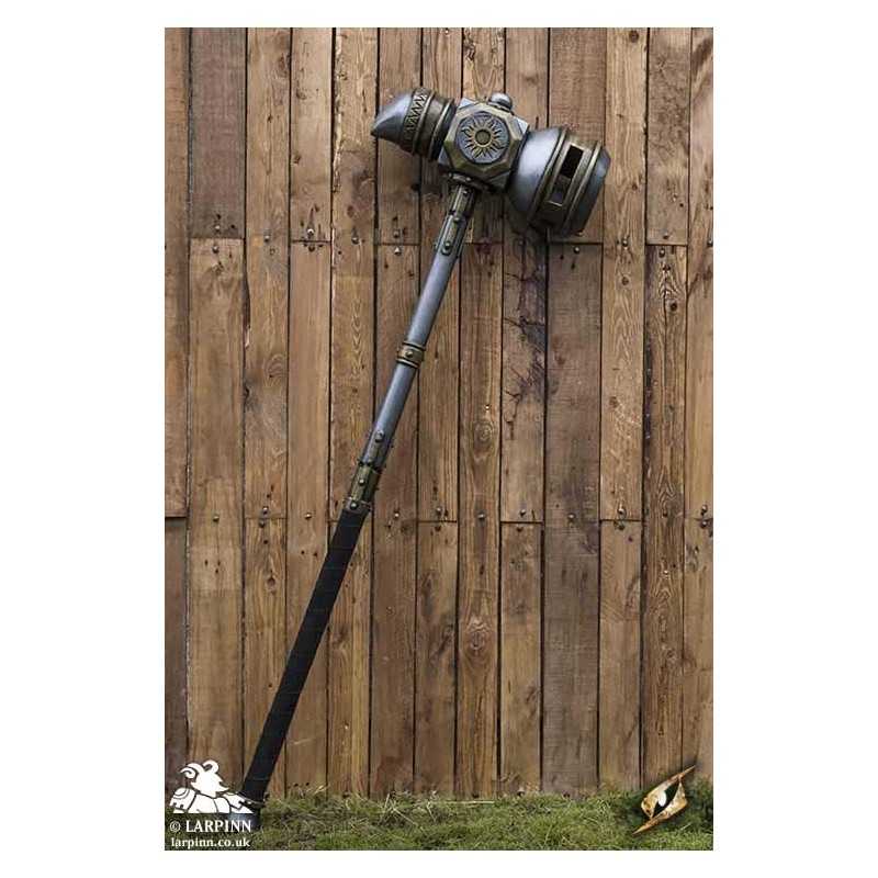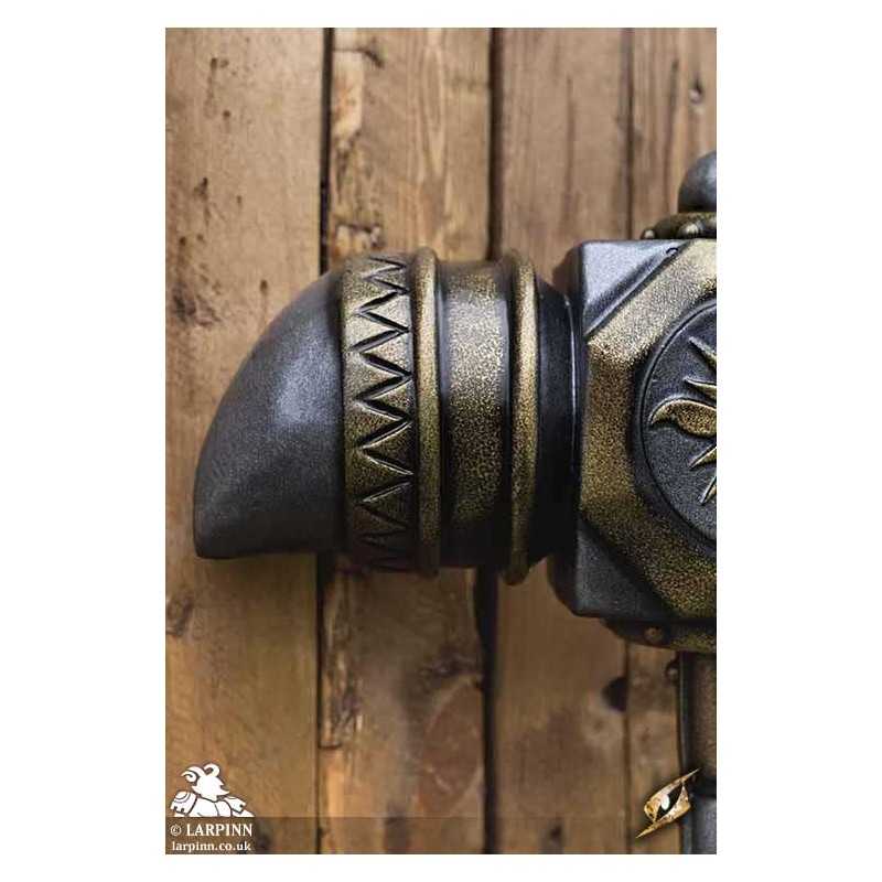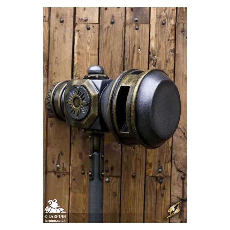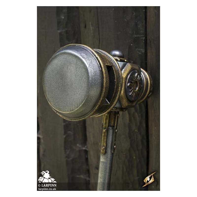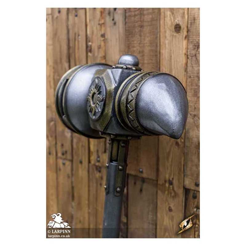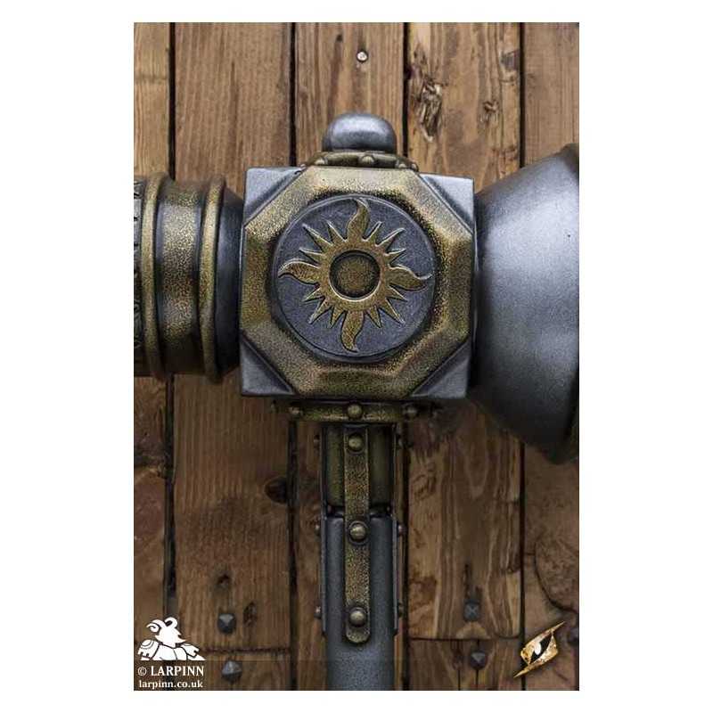 Epic Armoury’s Sun Hammer is a 135cm latex hammer uniquely designed to be safer and easier to wield in combat. The Sun Hammer’s 39cm long head is asymmetrical, featuring a flat 20cm wide face on one end and a spike on the other. The head is hollow, making it safer to use and more lightweight than a foam alternative. Sculpted and hand painted to look like dwarven forged metal, the head is attached to a similarly decorated haft and a 49cm black leather wrapped grip.