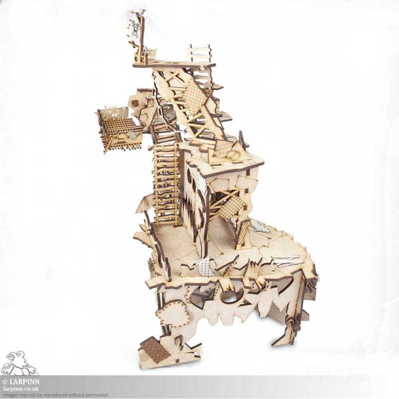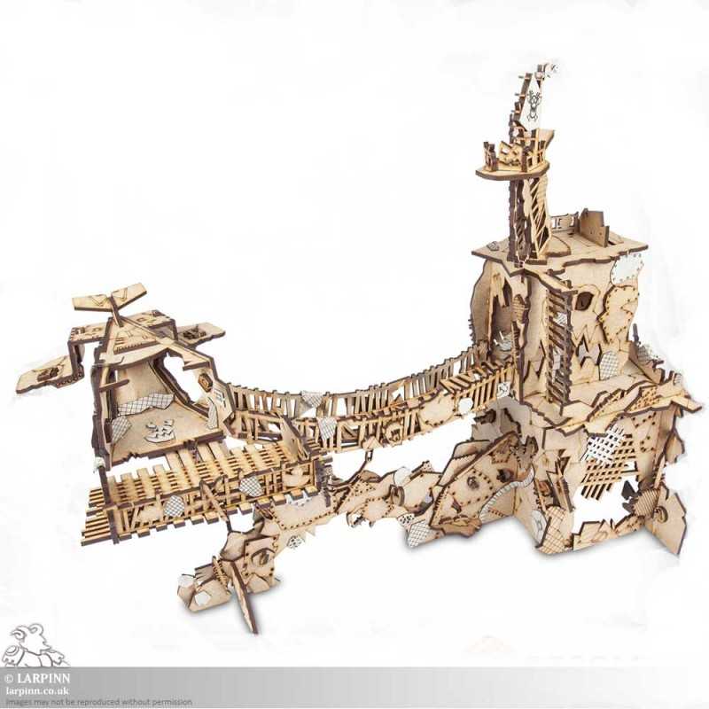 The Orc Tower is made of scrap metal piled high, with a cruiser welded to the top for good measure. A suspended bridge is the perfect place to line up and shoot the enemy. After all, the only thing better than choppin' is DAKKA! Spanning an approximate 45cm it's a massive buildin, with a high nest to spot enemies and plenty of space to spread out and defend the tower.