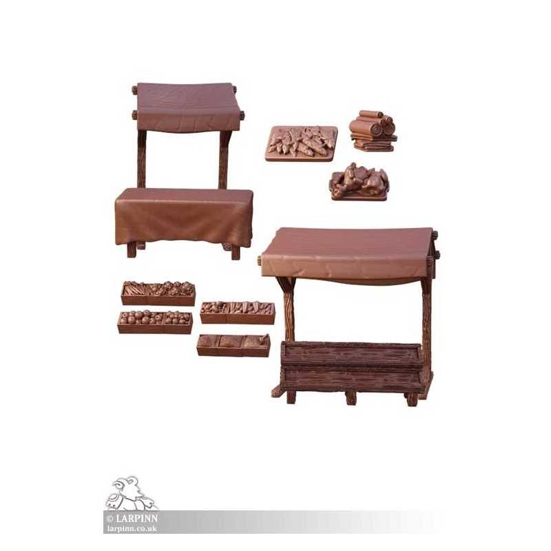 Found in the centre of towns and villages everywhere, market stalls are vital places to restock supplies and haggle for bargains! This set contains two market stalls, each with a variety of optional goods to sell.