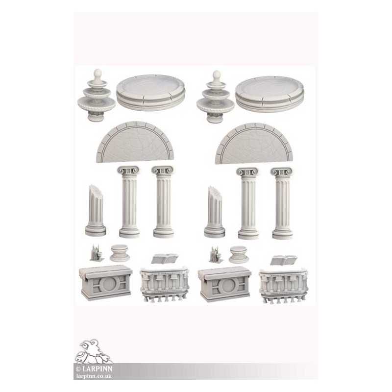 Say your prayers! This white plastic terrain set includes columns, altars, fonts, holy books, and fountains for you to create a temple interior, a set of ancient ruins, or even the plaza of a decadent city!