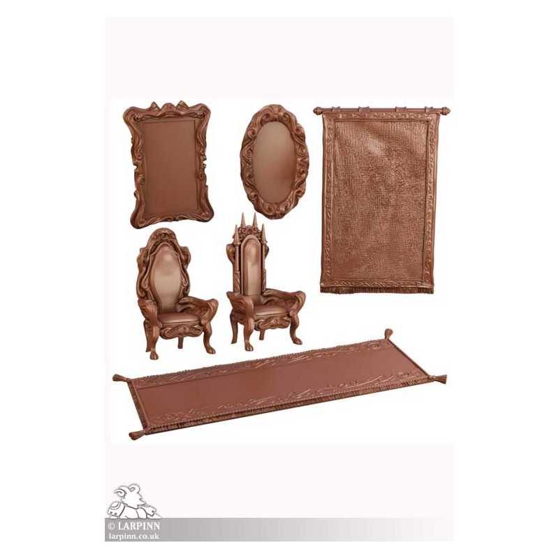 This set contains two ornate thrones, two portraits, a tapestry, and a luxurious carpet- enough to bedeck any area with enough finery to befit a king or noble.