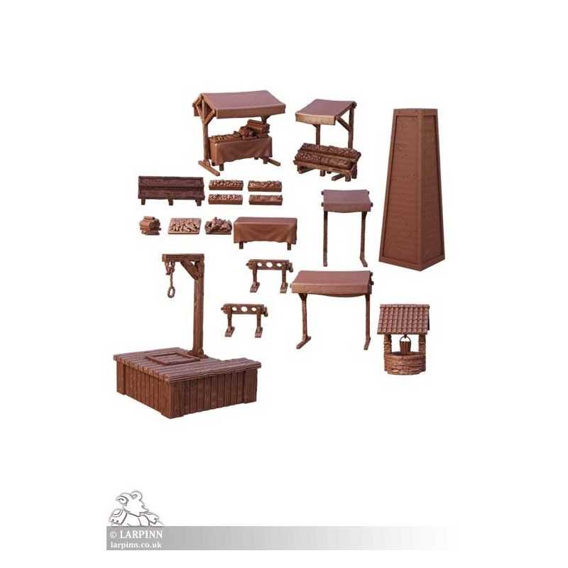 As your adventurers enter a bustling settlement, they might encounter a village market, ancient stone markers, or gallows and stocks. This set contains everything you would need to populate a bustling village square in any of your tabletop games.