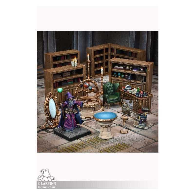This set contains everything that a sorcerous academic could need. There is a magic mirror, an orrery, several shelves full of alchemical equipment and tomes, and even a pet owl!
