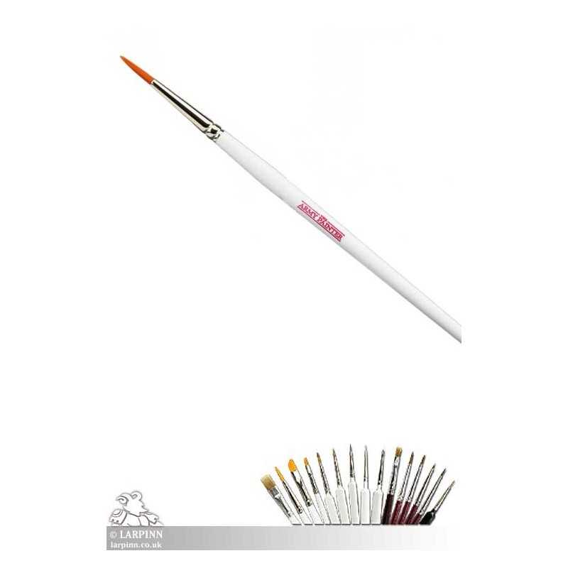 This brush is made from the finest Toray synthetic due to the fact that a sable brush of this size could potentially drown a miniature in paint - whereas the Toray releases the paint slower.