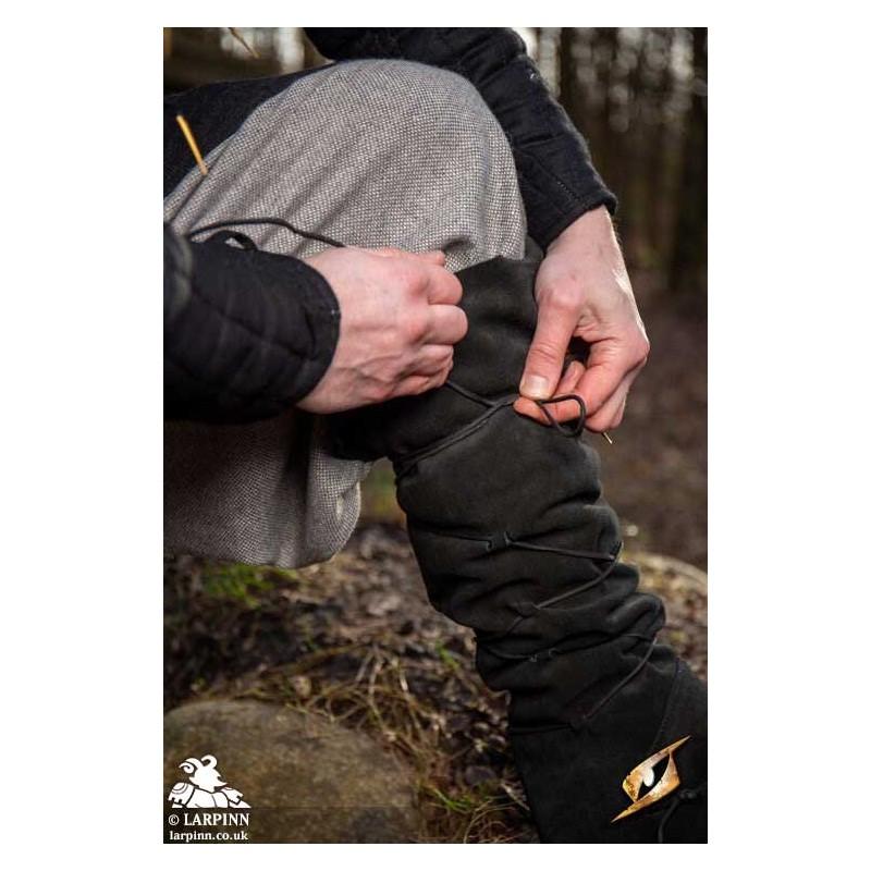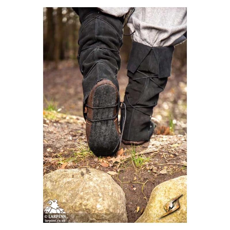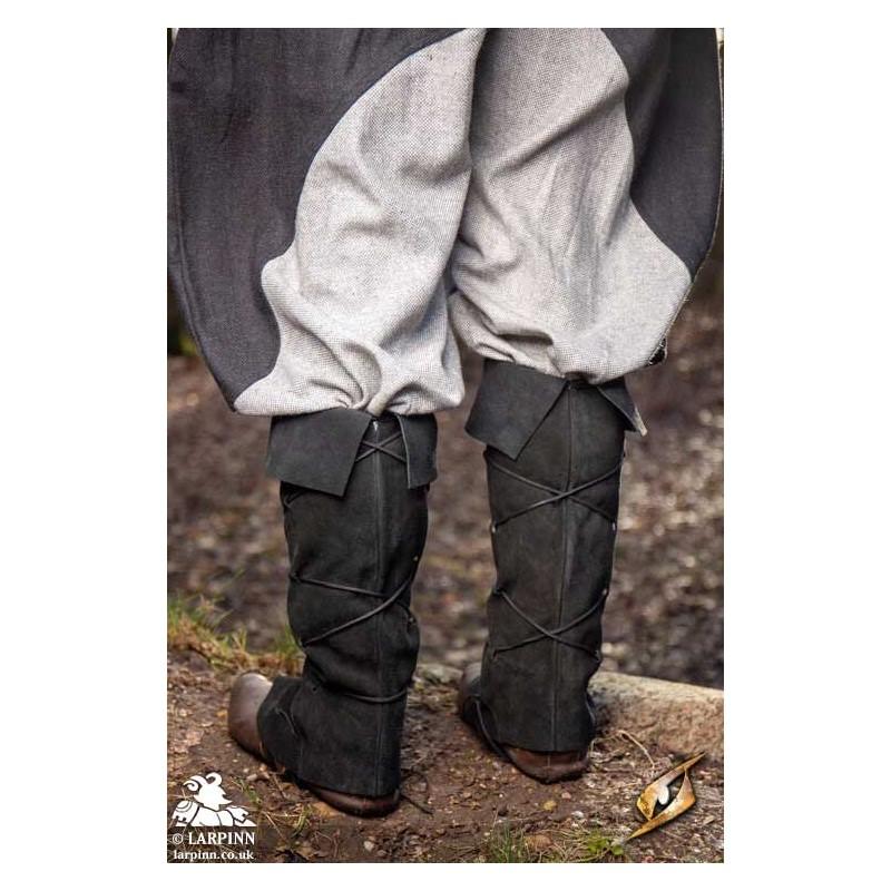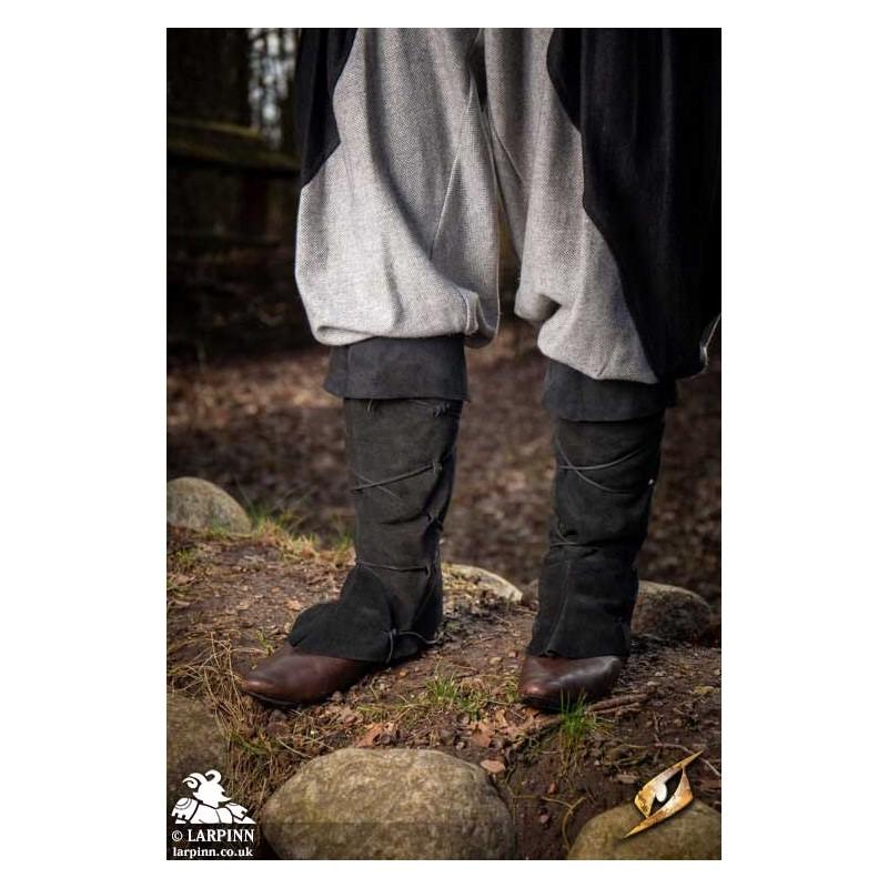 The Theodoric Gaiters are made from suede and protect your lower leg, boots, and shoes from dirt and water. They cover from the ankle and top of the foot to the knee, and you secure them by tightening the two leather laces around them, ensuring a close fit. Additional holes are at the bottom to secure the gaiters around your sole. Gaiters like these are often used to ensure that your modern footwear doesn't look out of place during a LARP event or as they were originally used to protect against mud, rain, snow, or dirt.