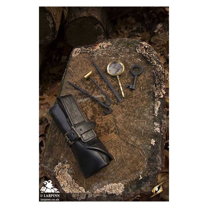 Keep all your Thieves Tools safe by storing them in the included holder made from soft, split-leather. Secure the holder closed using its top-grain leather strap, and keep it handy by attaching it to your belt using its hanger. Whether you are a rogue looking to make an easy coin, or an adventurer who wants to be ready for the most dangerous dungeons, the Thieves Tool set is a great prop to have!