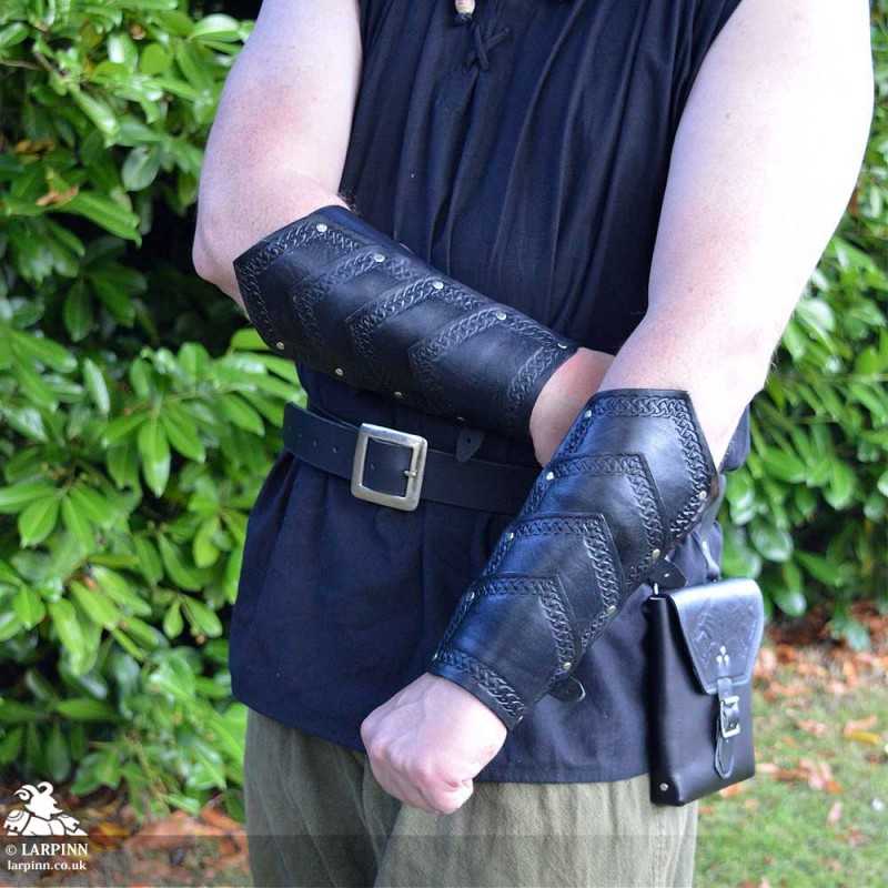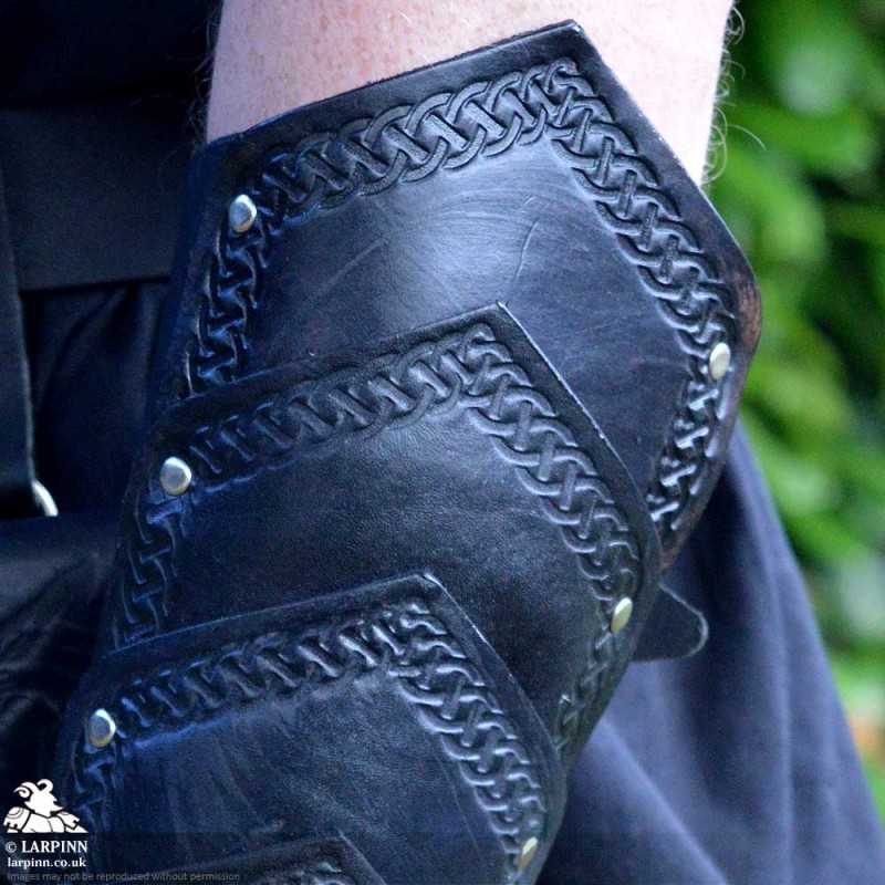 The Thordak Bracers are handcrafted here at Larp Inn. Each bracer is made from high-quality veg tan leather, cut, embossed and stained by us. The bracer is constructed from separate plates of leather riveted together to create a longer, segmented style, and the thickness makes them ideal for use as medium armour in many LARP games.