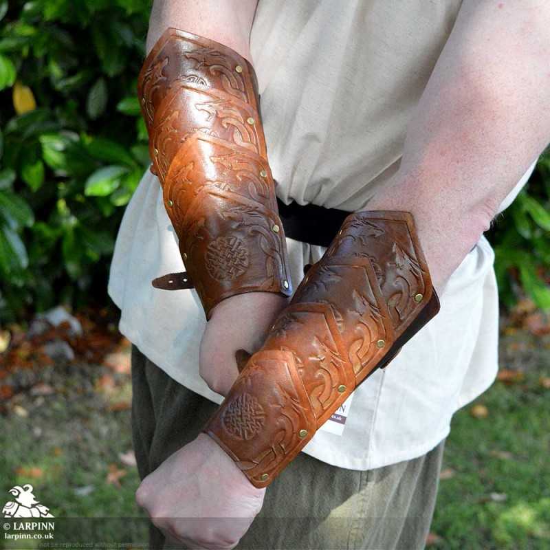 The Thordak Bracers are handcrafted here at Larp Inn. Each bracer is made from high-quality veg tan leather, cut, embossed and stained by us. The bracer is constructed from separate plates of leather riveted together to create a longer, segmented style, and the thickness makes them ideal for use as medium armour in many LARP games.
