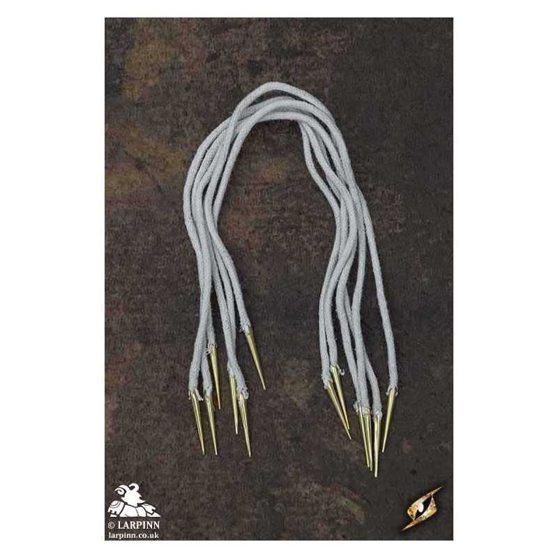 Epic Armoury’s Tie Strings with Points is a set of six cloth aiguillette cords designed to easily thread through eyelets on your cloth costume. Each end is securely fastened to a brass tip that makes lacing a breeze, keeps the cloth from unraveling, prolongs the string’s lifetime use, and gives your costume a polished look. There are five available tie string colours, so feel free to match or contrast your strings with your costume! For example, use this version to replace the strings on your Dorian Vest, or change up the look on your Imperial Gambeson by adding a different colour to the seams. It’s a great way to make your costume a little more unique.