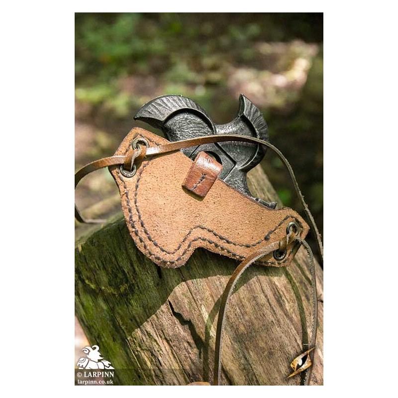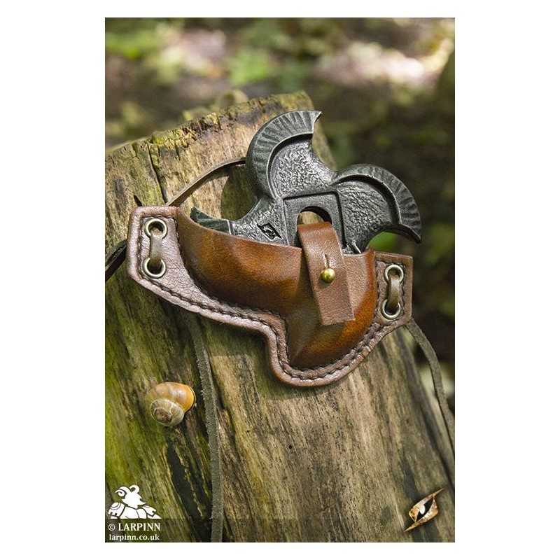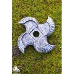 Epic Armoury’s Epic Black Tornado Shuriken Holder comes with a shuriken, and is specifically designed to hold the multi-bladed Epic Armoury Tornado Shuriken throwing weapon. The handmade holder attaches to the belt or armour using two leather ties. A leather strap buttons through the shuriken’s center, keeping it secure even in rough fights.