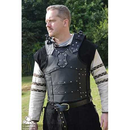 The Ulric Leather Armour is a flexible leather vest that can be worn on its own, or as part of the Ulric Armour Set. This armour is constructed from thick dyed leather which are both sewn and riveted in places. Each segment is layered and the edges are covered with soft leather edging. The flexibilty of the Ulric Armour is great in combat making this a fantastic LARP item. However, the style is great for a number of medieval and fantasy, cosplay and theatre costumes.