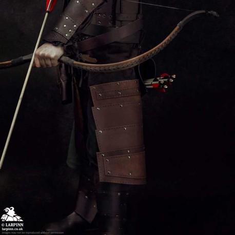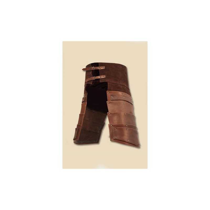 The Ulric Upper Leg Armour are closed with a wide, comfortable suede belt with two buckles around your hip. On the backside they can be adjusted individually with a leather strap, which allows this belt to be fitted to the wearer.