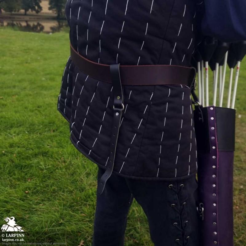 Its adjustable design allows you to wear it on your hip at an angle, straight down, or in the traditional back-mounted style—giving you the freedom to match your combat style and costume. A clever detachable system lets you remove the quiver from your belt while leaving the fittings in place, making it easy to quickly strip off your gear—or just take a convenient loo break—without fuss. Built to hold 10 LARP-safe arrows, the Vallo Quiver balances form and function, ensuring your equipment is always within reach when the moment to strike arrives.