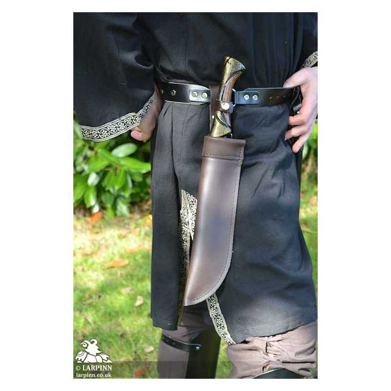 The Varius Dagger Scabbard is a handmade leather dagger holder which ensures that your weapon is kept safe and secure. Designed for use with Larp, Cosplay or theater costumes, the soft trim helps to protect latex props and the popper design can be used to provide extra security for smaller blades. This particular holster hangs straight down and uses a D ring to increase flexibility when you move.