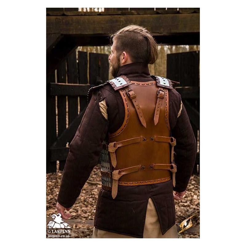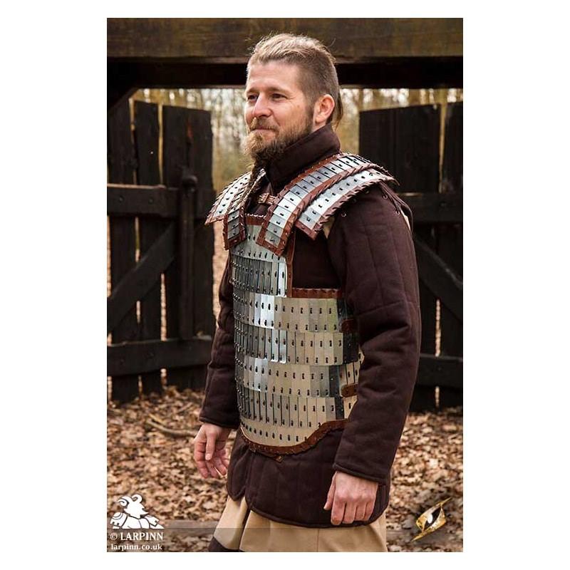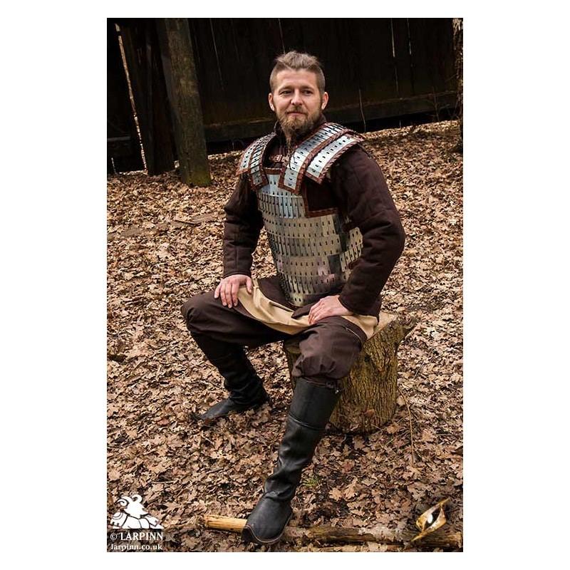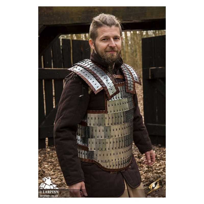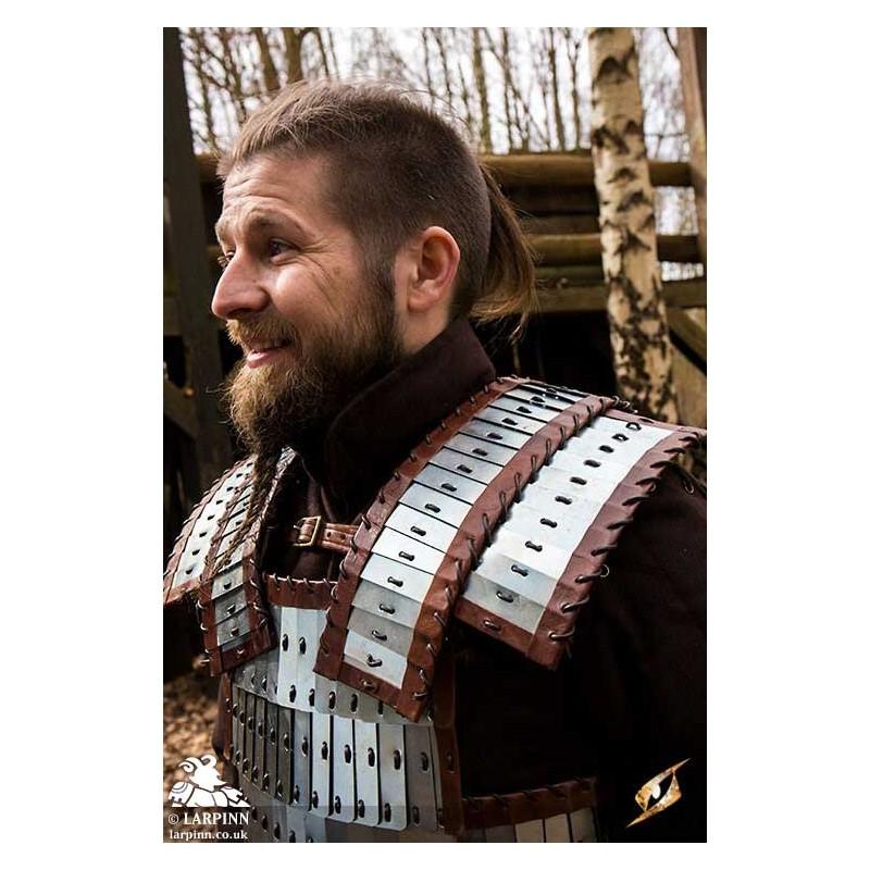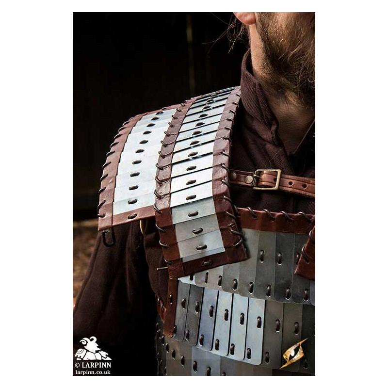 Epic Armoury’s Viking Armour is a breastplate and backplate inspired by lamellar worn by the Vikings, protecting the front and back of the torso. Made from layers of mild steel plates connected with durable leather cording, this armour is flexible and impressive in detail. Strong leather lines the armour around the edges to add comfort, while adjustable leather straps along the sides and on the shoulders attach the front to a solid leather backplate. This steel piece has been treated with Epic Armoury's Epic Dark Metal coat to give the armour a rugged, antique finish.