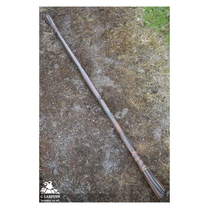 The Walking Staff is a 190 cm latex staff handpainted and sculpted to look like realistic worn wood. Both ends have been detailed to appear about to split, with leather bindings reinforcing each end to prevent further ‘damage.’ Dents and notches along the staff further hints at this Wooden Staff’s abuse in combat. With a 5 cm diameter, hold this weapon comfortably anywhere depending on your fighting style.