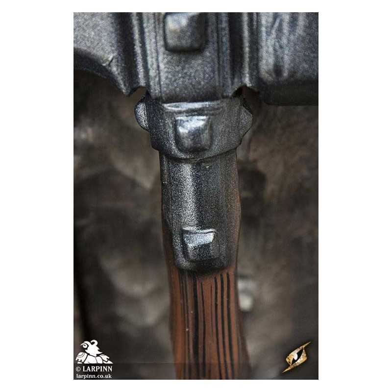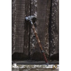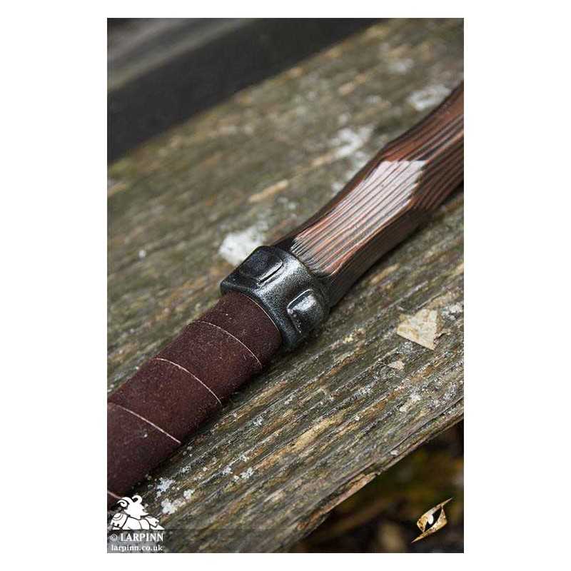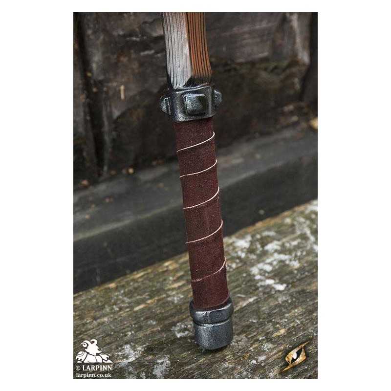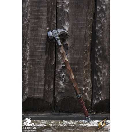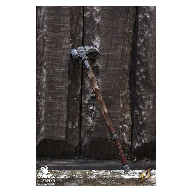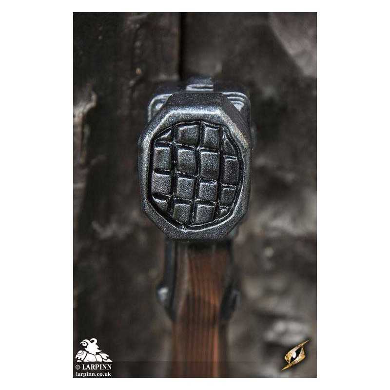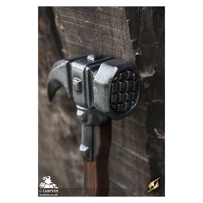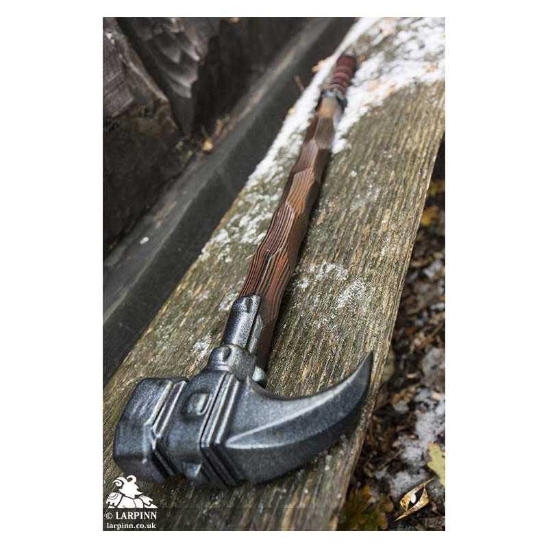 Epic Armoury’s Warhammer is an 85 cm latex warhammer inspired by weapons of the late medieval period. This particular hammerhead is a slightly larger imitation with a smaller spike, specifically designed for a fantasy appearance and regard for larp safety. The hammer’s face is octagonal, and is 7 cm long from the haft. The claw-like spike is 10 cm long. With handpainted and sculpted detail, this hammer is designed to look like worn dark wood. The 20 cm handle is wrapped in brown split leather for a superior grip.